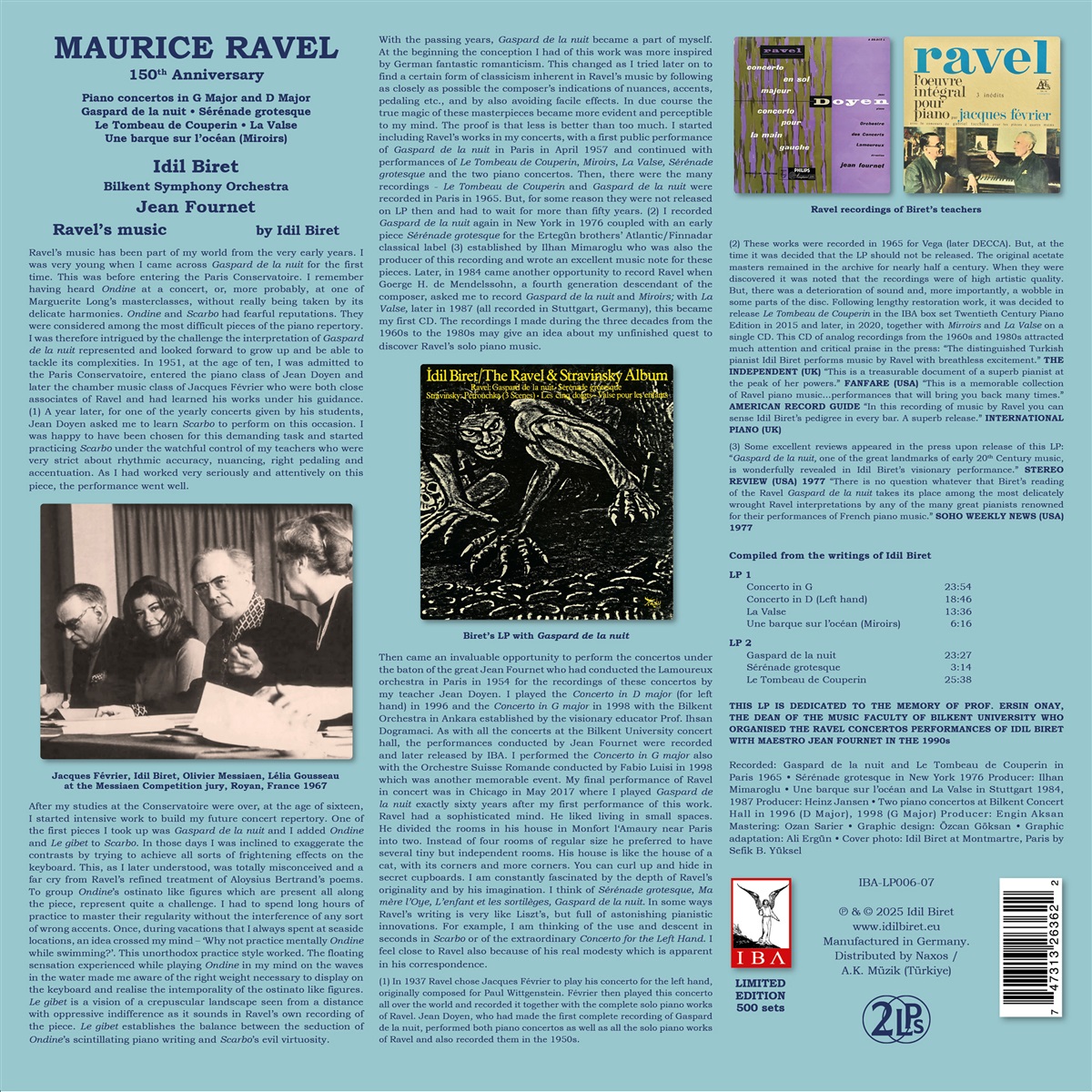 Anlässlich des 150. Geburtstags von Maurice Ravel lenkt diese Sonderausgabe mit der renommierten Pianistin Idil Biret den Blick auf die berühmtesten Werke des Jubilars, darunter Gaspard de la nuit, Le Tombeau de Couperin, La Valse, Une barque sur l'océan und die Klavierkonzerte in G- und D-Dur. Begleitet vom Bilkent Symphony Orchestra unter Jean Fournet wird Birets tiefe persönliche und künstlerische Verbindung zu Ravels Musik lebendig. Die Edition enthält historischen Kontext, seltene Aufnahmen und Reflexionen von Biret selbst, die ihren Weg von den frühen Studien in Paris bis hin zu bahnbrechenden Aufführungen und Aufnahmen nachzeichnen. Bei der Erstauflage wurde vor allem die LP mit Gaspard de la nuit von der Kritik für ihre technische Brillanz und emotionale Tiefe gelobt.