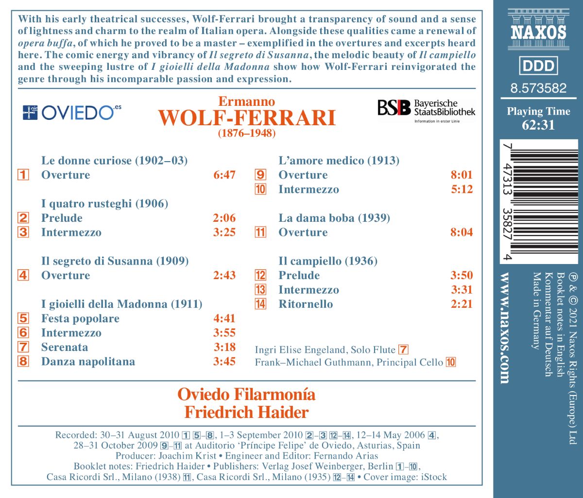 Mit seinen frühen Bühnenerfolgen brachte der deutsch-italienische Komponist Ermanno Wolf-Ferrari klangliche Transparenz, Leichtigkeit und Charme in die italienische Oper zurück. Diese Charaktermerkmale führten zu einer (letzten?) Erneuerung der Opera buffa, in der er sich als Meister erwies, wie die hier zu hörenden Ouvertüren und Intermezzi belegen. Die komische Energie und Lebhaftigkeit von „Il segreto di Susanna“, die melodische Schönheit von „Il campiello“ und der mitreißende Glanz von „I gioielli della Madonna“ zeigen, wie Wolf-Ferrari das Genre durch seine unvergleichliche Leidenschaft und seinen Ausdruck neu belebte.