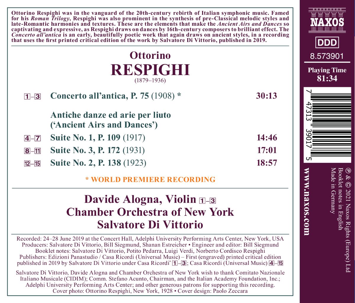 Diese Synthese kann man beispielhaft in den drei Suiten der „Antiche danze ed arie per liuto“ nachvollziehen, in denen Respighi Tänze des 16. Jahrhunderts verarbeitete. Schon das frühe „Concerto all'antica“ griff auf Stilelemente des barocken Konzerts zurück.