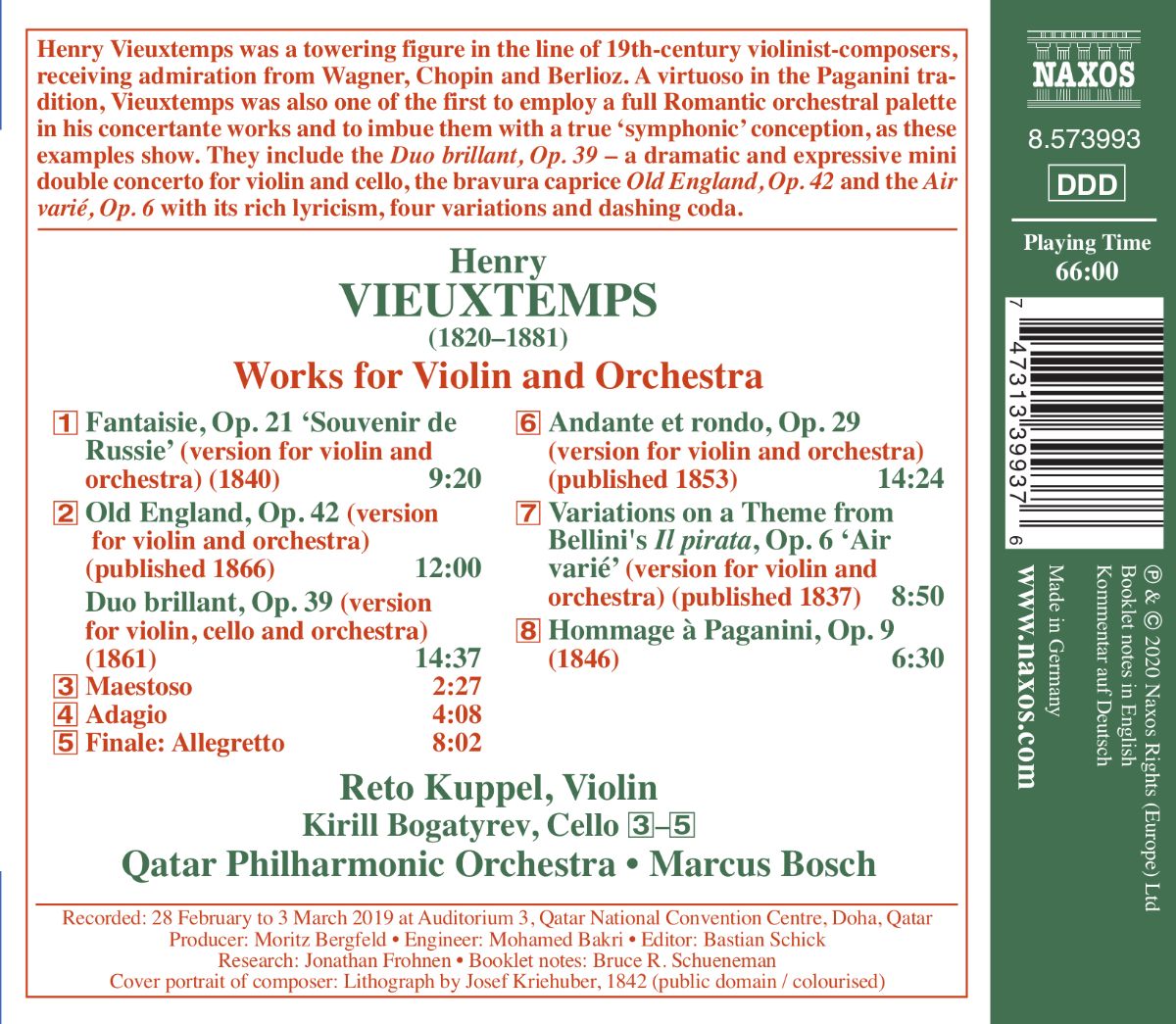 Als Virtuose in bester Paganini-Tradition gehörte Vieuxtemps zu den ersten, die in ihren konzertanten Werken die ganze Palette der Klangmöglichkeiten des romantischen Orchesters einsetzten und ihnen eine echte „sinfonische Form“ verliehen, wie die auf dem vorliegenden Album zusammengefassten Beispiele belegen. Dazu gehören das „Duo brillant“, ein dramatisches und ausdrucksstarkes Mini-Doppelkonzert für Violine und Violoncello, das bravourös-kapriziöse „Old England“ und die „Air varié“ mit ihrem lyrischen Reichtum, vier Variationen und einer flotten Coda.