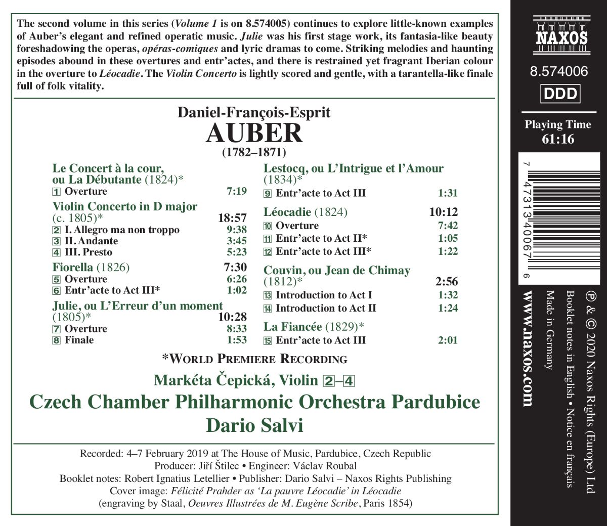 „Julie“ war Aubers erstes Bühnenwerk, dessen fantasievolle, märchenhafte Schönheit kommende Großtaten vorwegnahm. In der Ouvertüre zu „Le Concert à la cour“ wie in den hier zusammengefassten Entr'actes sind zahlreiche wundervolle Melodien zu entdecken, bemerkenswert etwa die iberische Note in der Ouvertüre zu „Léocadie“. Das Violinkonzert in D-Dur – hier in einer Weltersteinspielung mit Markéta ?epická als Solistin – ist leicht und verspielt, mit einem Tarantella-ähnlichen Finale voller Vitalität.