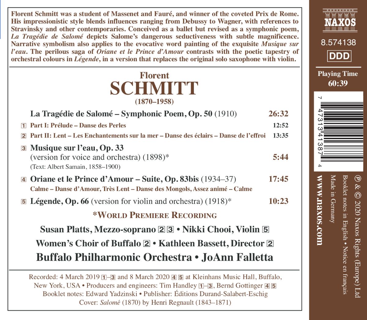 Als Ballett konzipiert, aber als symphonische Dichtung überarbeitet, schildert „La Tragédie de Salomé“ Salomes verhängnisvolle Verführungskunst mit subtiler Prägnanz. Die Kraft der erzählerischen Symbolik ist auch in der beschwörenden Wortmalerei der „Musique sur l'eau“ zu hören. Die tragische Erzählung von „Oriane et le Prince d'Amour“ kontrastiert mit dem lyrisch-farbenreichen Klangteppich des Orchesters in „Légende“, das hier in einer Fassung zu hören ist, in der das ursprüngliche Solo-Saxophon mit einer Violine ersetzt wird.