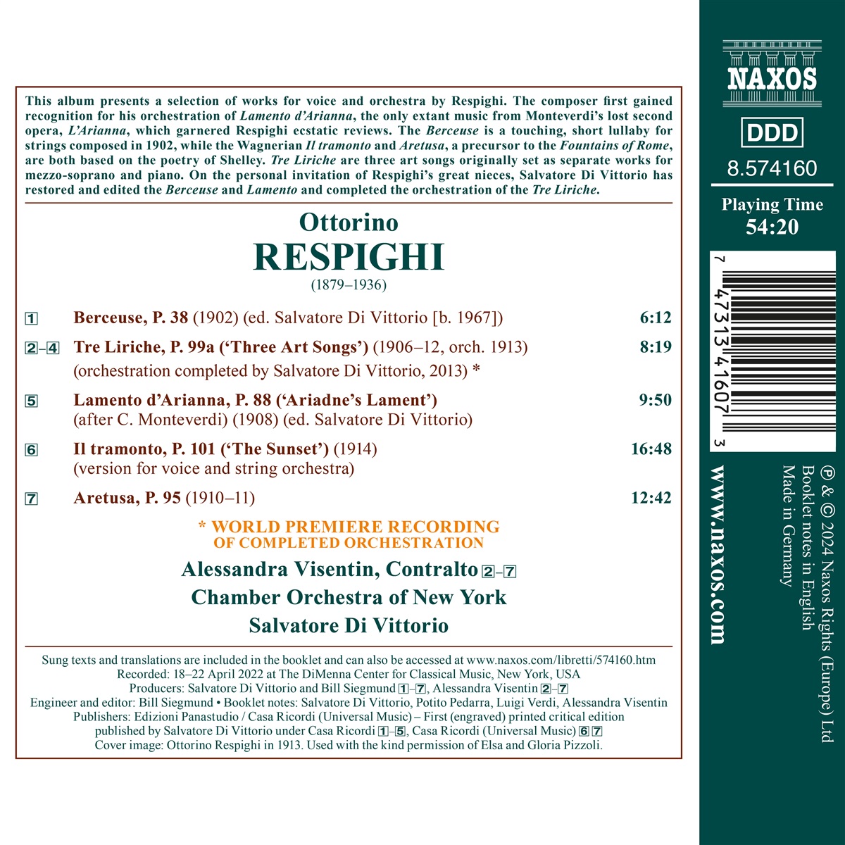 Dieses Album präsentiert eine Auswahl von Werken für Gesang und Orchester von Ottorino Respighi. Der Komponist erlangte erstmals Anerkennung für seine Orchestrierung von „Lamento d'Arianna“, der einzigen erhaltenen Musik aus Monteverdis verlorener zweiter Oper „L'Arianna“, die Respighi begeisterte Kritiken einbrachte. Die „Berceuse“ ist ein bewegendes, kurzes Wiegenlied für Streicher aus dem Jahr 1902, während die wagnerischen „Il tramonto“ und „Aretusa“, ein Vorläufer der „Fontane di Roma“, beide auf Gedichten von Shelley basieren. „Tre Liriche“ sind drei Kunstlieder, die ursprünglich als separate Werke für Mezzosopran und Klavier komponiert wurden. Auf persönliche Einladung von Respighis Großnichten hat Salvatore Di Vittorio die Werke „Berceuse“ und „Lamento“ rekonstruiert und bearbeitet und die Orchestrierung der „Tre Liriche“ vervollständigt.