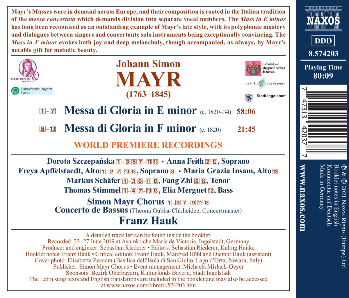 Johann Simon Mayrs Messen waren in ganz Europa gefragt und ihre Gestaltung wurzelt in der italienischen Tradition der Messa concertata, die eine Aufteilung in einzelne Vokalnummern verlangt. Die Messe in e-Moll gilt seit Langem als herausragendes Beispiel für Mayrs späten Stil, der durch seine polyphone Beherrschung und die Dialoge zwischen Sängern und konzertierenden Soloinstrumenten ausgesprochen eindringlich ist. Die frühere f-Moll-Messe beschwört sowohl Freude als auch tiefe Melancholie herauf, stets begleitet von Mayrs bemerkenswerter Gabe für melodische Schönheit.
