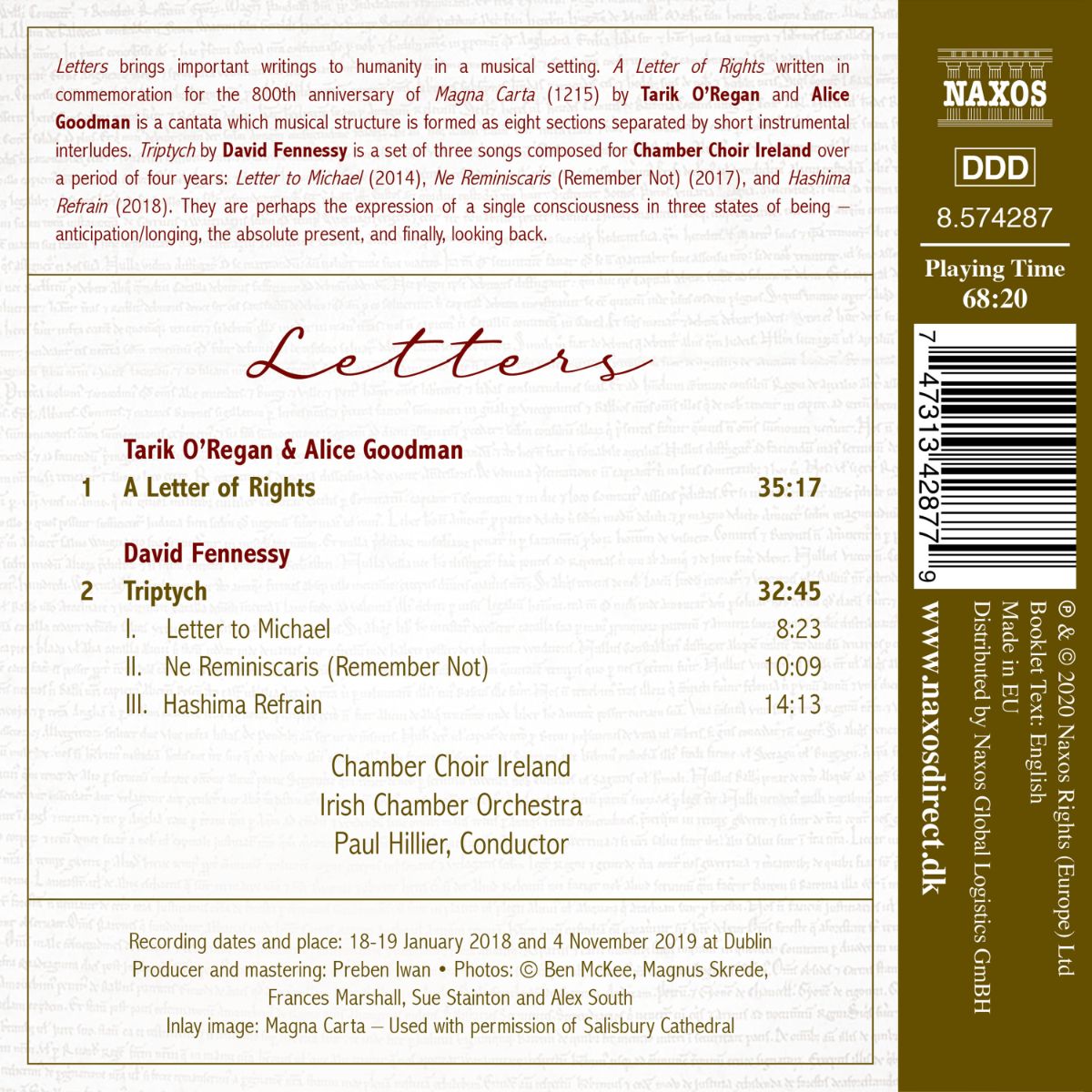 Auf „Letters“ ist Chorleiter und Dirigent Paul Hillier mit dem Chamber Choir Ireland und dem Irish Chamber Orchestra mit Werken zweier zeitgenössischer Komponisten zu hören: Tarik O’Regans „A Letter of Rights“, geschrieben, anlässlich des 800. Jahrestages des Inkrafttretens der ‚Magna Carta‘ und „Triptych“, einem dreiteiligen Chorzyklus von David Fennessy.