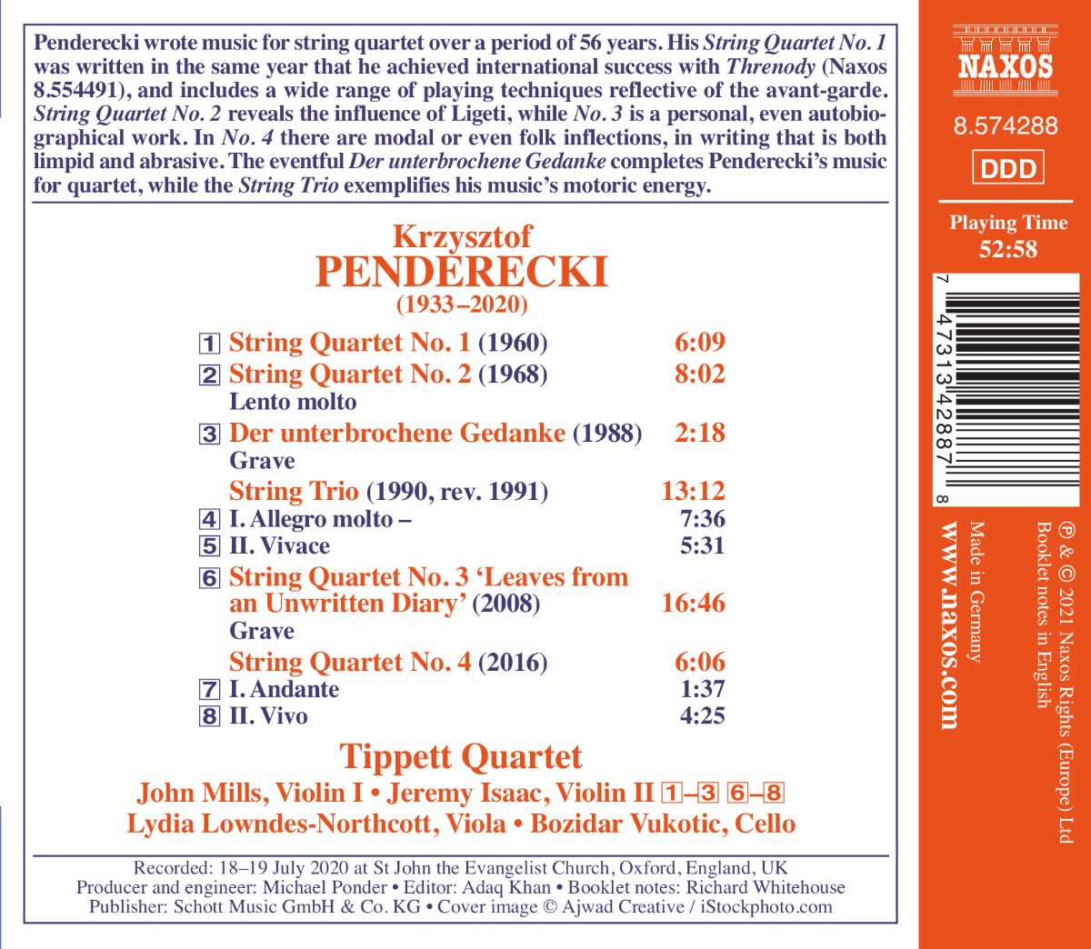 Penderecki schrieb seine Musik für Streichquartett über einen Zeitraum von 56 Jahren. Sein erstes, avantgardistisch angelegtes Streichquartett entstand 1960 zur selben Zeit, als er seinen ersten internationalen Erfolg „Threnos“ komponierte. Das Streichquartett Nr. 2 zeigt den Einfluss von Ligeti, während Nr. 3 ein autobiografisches Werk ist. Pendereckis viertes Quartett (von 2016) zeigt modale, sogar volkstümliche Anklänge auf eine schroffe, aber gleichzeitig klare Art. Der kurze Satz „Der unterbrochene Gedanke“ vervollständigt sein Werk für Streichquartett. Das ergänzende Streichtrio verdeutlicht noch einmal die motorische Energie seiner Musik.