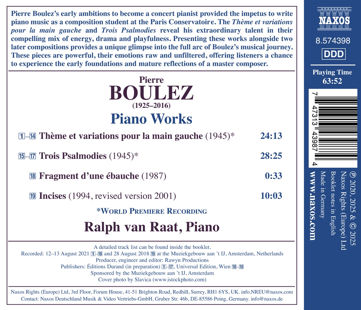 Der renommierte Pianist und Boulez-Spezialist Ralph van Raat präsentiert eine weitere Aufnahme aus dem ausgezeichneten Konzertsaal Muziekgebouw aan’t IJ in Amsterdam. Pierre Boulez’ frühe Ambitionen, Konzertpianist zu werden, gaben ihm den Anstoß, als Kompositionsstudent am Pariser Konservatorium Klaviermusik zu schreiben. „Thème et variations pour la main gauche“ und „Trois Psalmodies“ offenbaren sein außergewöhnliches Talent in ihrer fesselnden Mischung aus Energie, Dramatik und Verspieltheit. Die Präsentation dieser Werke zusammen mit zwei späteren Kompositionen bietet einen einzigartigen Einblick in den gesamten musikalischen Werdegang von Boulez. Diese Stücke sind kraftvoll, ihre Emotionen sind roh und ungefiltert und bieten den Zuhörern die Möglichkeit, die frühen Grundlagen und reifen Reflexionen eines Meisterkomponisten zu erleben.