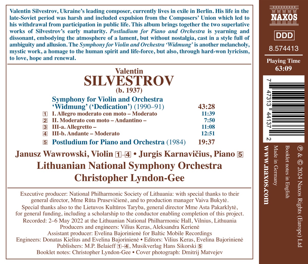Nachdem Dirigent Christopher Lyndon-Gee bereits mit dem Lithuanian National Symphony Orchestra Valentin Silvestrovs 7. Sinfonie einspielte, wendet er sich nun den beiden vorliegenden herausragenden Werken aus dem frühem Erwachsenenleben des Komponisten zu. Das Postludium für Klavier und Orchester ist sehnsüchtig und dissonant, es verkörpert die Atmosphäre eines Klagelieds, jedoch ohne Nostalgie, in einem Stil voller Zweideutigkeit und Anspielungen. Die Sinfonie für Violine und Orchester „Widmung“ ist ein weiteres melancholisches, mystisches Werk, eine Hommage an den menschlichen Geist und die Lebenskraft sowie an Liebe, Hoffnung und Erneuerung.