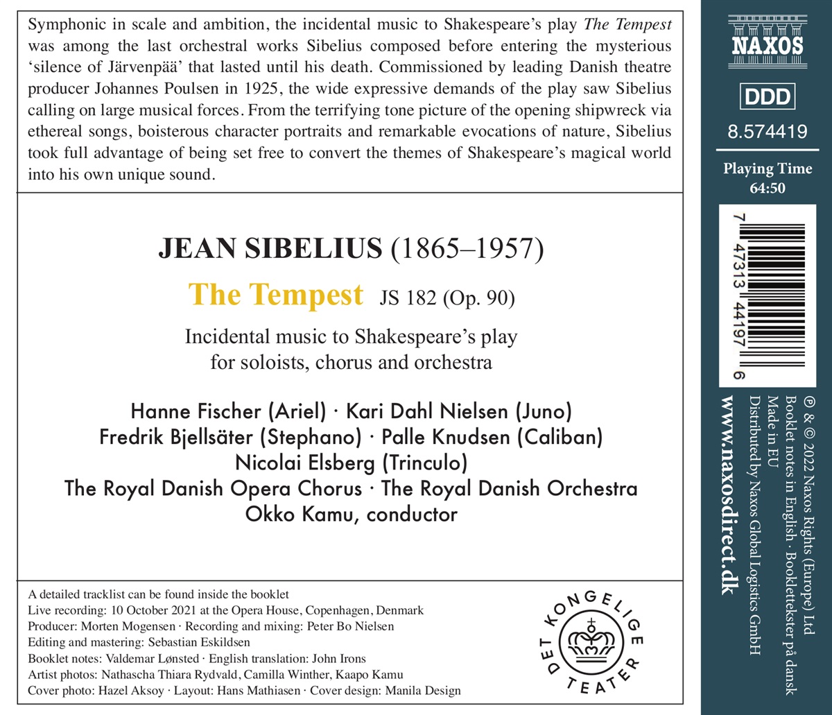 Die sinfonische Bühnenmusik zu Shakespeares „Der Sturm“ war eines der letzten Orchesterwerke, die Jean Sibelius komponierte, bevor er in das rätselhafte „Schweigen von Järvenpää“ verfiel, das bis zu seinem Tod andauerte. Im Jahr 1925 vom führenden dänischen Theaterproduzenten Johannes Poulsen in Auftrag gegeben, verwendete Sibelius aufgrund der hohen Ausdrucksanforderungen des Stücks einen großen musikalischen Apparat. Vom schaurigen Tongemälde des eröffnenden Schiffbruchs über schwebende Lieder, ungestüme Charakterisierungen und eindringliche Naturschilderungen nutzte Sibelius hier alle Freiheiten, die Themen von Shakespeares magischer Welt in seinen eigenen, einzigartigen Klang umzusetzen.