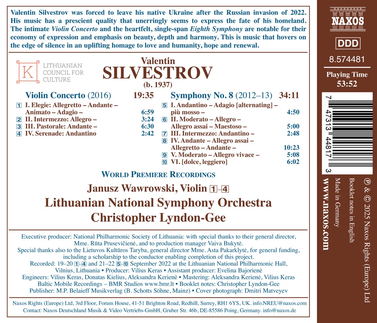 Valentin Silvestrov war gezwungen, seine Heimat Ukraine nach der russischen Invasion 2022 zu verlassen. Seine Musik hat eine vorausschauende Qualität, die das Schicksal seines Heimatlandes treffsicher zum Ausdruck zu bringen scheint. Das intime Violinkonzert und die zu Herzen gehende, einteilige Achte Symphonie zeichnen sich durch ihre Ökonomie des Ausdrucks und die Betonung von Schönheit, Tiefe und Harmonie aus. Diese Musik schwebt am Rande der Stille und ist eine erbauliche Hommage an Liebe und Menschlichkeit, Hoffnung und Erneuerung.