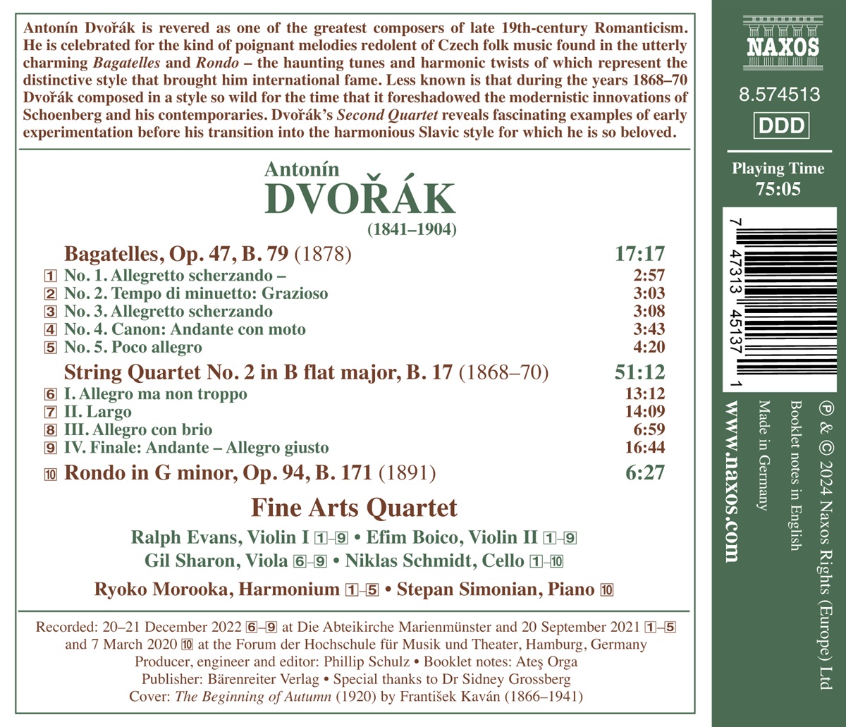 Antonin Dvorak ist berühmt für seine an die tschechische Volksmusik angelehnten, anrührenden Melodien, wie zum Beispiel in den entzückenden Bagatellen und Rondos, deren eindringliche Klangfarben seinen unverwechselbaren Stil ausmachen. Weniger bekannt ist, dass Dvorak in den Jahren 1868-70 in einem für diese Zeit so wilden Stil komponierte und in diesem die modernistischen Neuerungen Schönbergs & Co. quasi vorwegnahm. Das 2. Streichquartett ist ein faszinierendes Beispiel für seine frühen Experimente, bevor er seinen typischen ‚slawischen Stil‘ fand, der ihn international berühmt machte.
