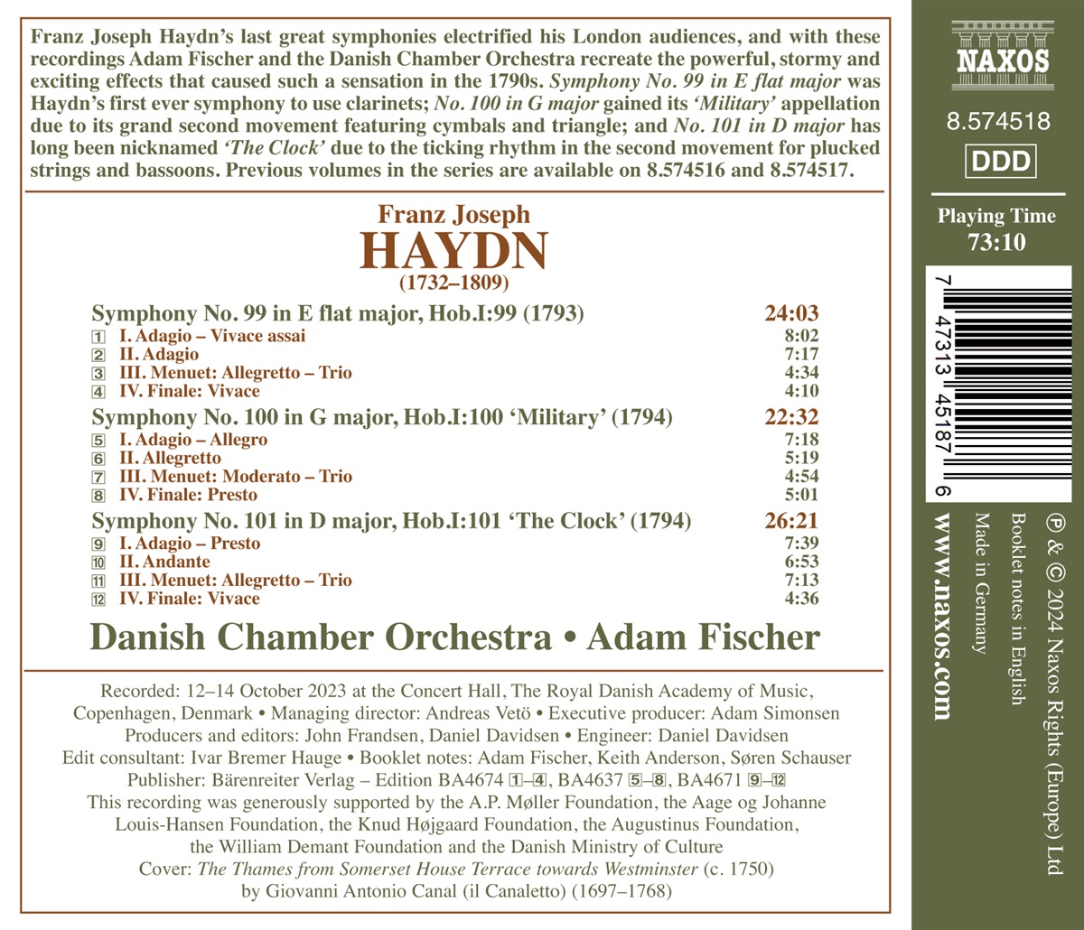 Joseph Haydns letzte große Sinfonien begeisterten sein Londoner Publikum: Mit dieser Aufnahmereihe erwecken Adam Fischer und das Danish Chamber Orchestra die kraftvollen, stürmischen und aufregenden Effekte, die in den 1790er Jahren so viel Aufsehen erregten, zu neuem Leben. Die Sinfonie Nr. 99 in Es-Dur war Haydns erste, in der Klarinetten verwendet wurden. Die Sinfonie Nr. 100 in G-Dur erhielt ihre Bezeichnung „Militär“ aufgrund ihres großartigen zweiten Satzes mit Zimbeln und Triangel und die Sinfonie Nr. 101 in D Dur wird wegen des tickenden Rhythmus im zweiten Satz für Zupfinstrumente gerne als „Die Uhr“ bezeichnet.