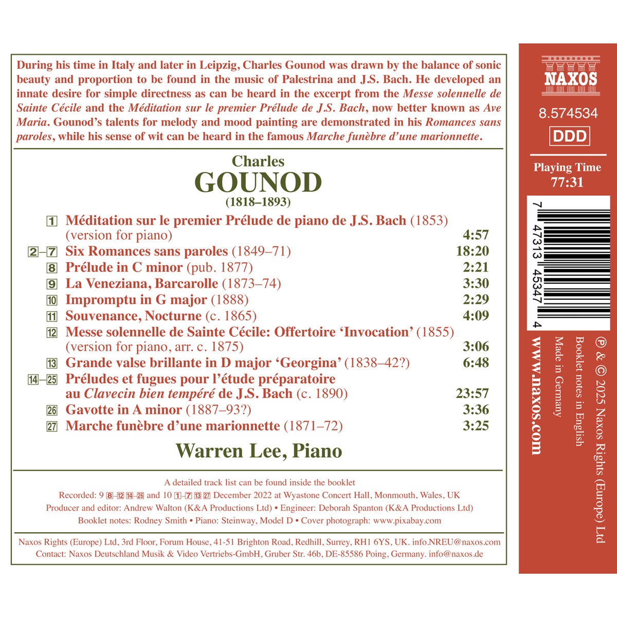 Während seiner Zeit in Italien und später in Leipzig war Charles Gounod von der Ausgewogenheit zwischen klanglicher Schönheit und Proportionen in der Musik von Giovanni Pierluigi da Palestrina und Johann Sebastian Bach fasziniert. Er entwickelte ein Verlangen nach einfacher Direktheit, das in Auszügen aus der „Messe solennelle de Sainte Cécile“ und der „Méditation sur le premier Prélude de J. S. Bach“, heute besser bekannt als „Ave Maria“, zu hören ist. Gounods Talent für Melodien und Stimmungsmalerei zeigt sich in seinen „Romances sans paroles“, während sein Sinn für Humor in der berühmten „Marche funèbre d’une marionnette“ zum Ausdruck kommt. Der Steinway-Künstler, preisgekrönte Komponist und Pianist Warren Lee hat in den letzten Jahren auch „Le Bal“ von Anton Rubinstein und „Ungarischer Romanzero“ von Franz Liszt aufgenommen und dafür viel Lob von der Presse erhalten. Er trat auf vier Kontinenten auf, oft in Zusammenarbeit mit internationalen Künstlern und führenden Orchestern.