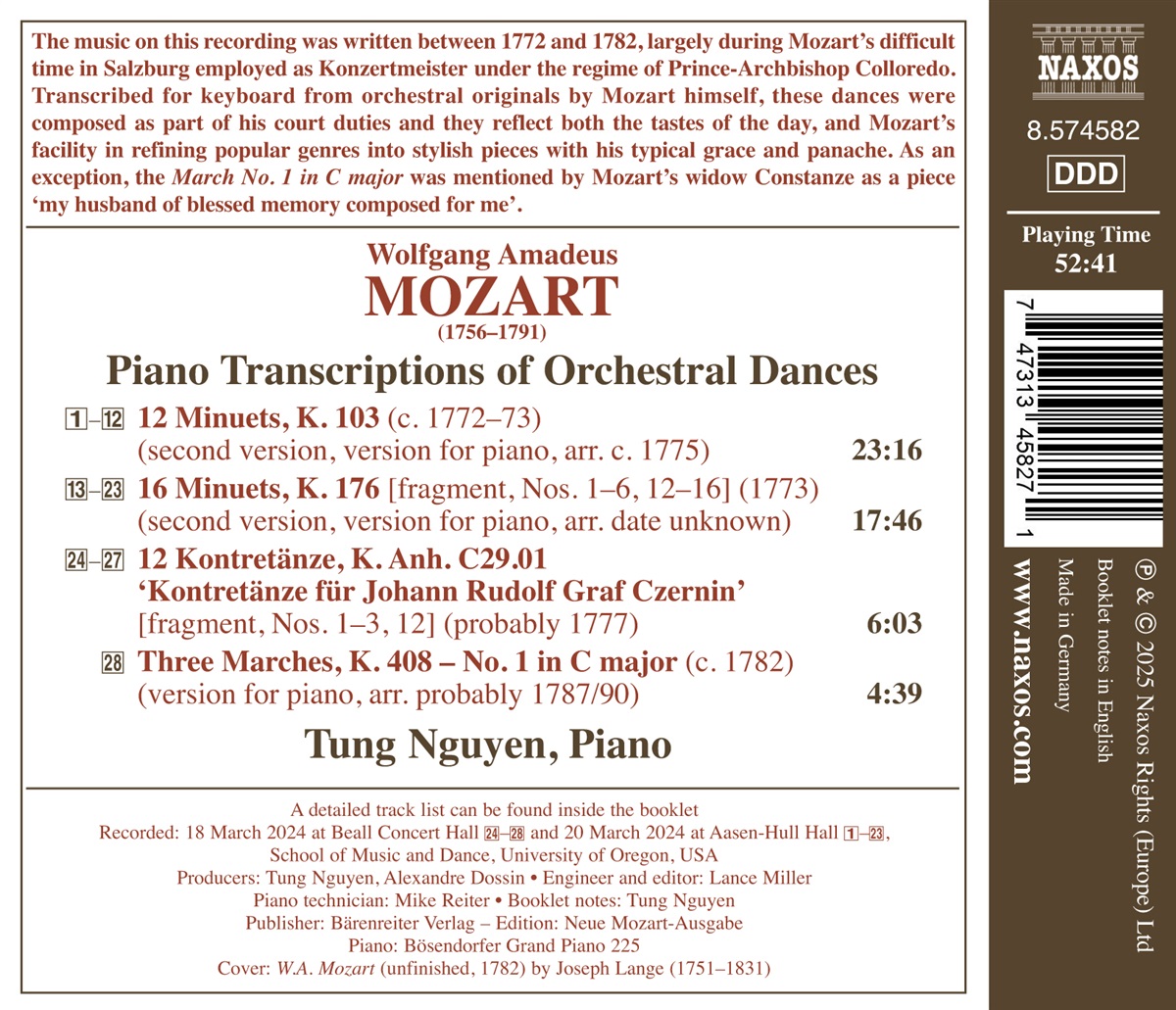 Die Musik auf dieser Aufnahme wurde zwischen 1772 und 1782 geschrieben, größtenteils während Mozarts schwieriger Zeit in Salzburg, als er unter dem Regime des Fürsterzbischofs Colloredo als Konzertmeister angestellt war. Diese Tänze wurden von Mozart selbst aus Orchesteroriginalen für das Keyboard transkribiert und als Teil seiner höfischen Pflichten komponiert. Sie spiegeln sowohl den Geschmack der damaligen Zeit als auch Mozarts Fähigkeit wider, populäre Genres mit seiner typischen Anmut und seinem Schwung zu stilvollen Stücken zu verfeinern. Als Ausnahme wurde der Marsch Nr. 1 in C-Dur von Mozarts Witwe Constanze als ein Stück erwähnt, das ‚mein seliger Ehemann für mich komponiert hat‘. Der vietnamesische Pianist Tung Nguyen hat in zahlreichen Konzerten in Europa und Oregon als Solist und begleitender Pianist mitgewirkt und ist Preisträger nationaler und internationaler Klavierwettbewerbe, insbesondere des internationalen Wettbewerbs für junge Musiker ‚Città di Barletta‘ in Italien und des Wettbewerbs für junge Künstler der Music Teachers National Association (MTNA).