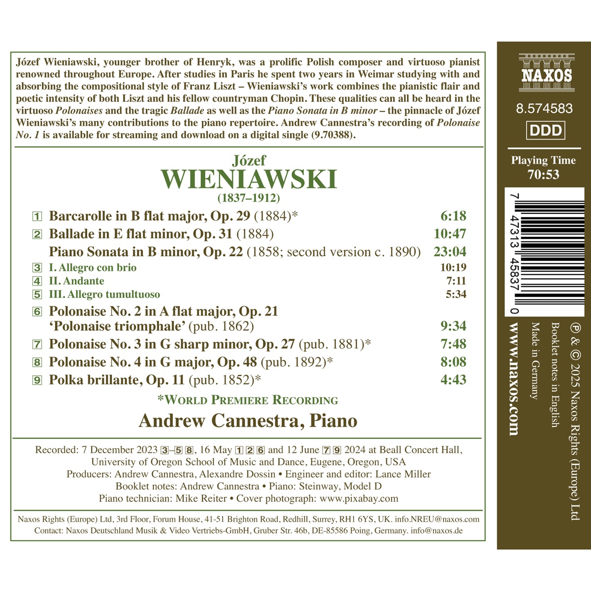 Józef Wieniawski, der jüngere Bruder von Henryk, war ein produktiver polnischer Komponist und Virtuose am Klavier, der in ganz Europa bekannt war. Nach seinem Studium in Paris verbrachte er zwei Jahre in Weimar, wo er bei Franz Liszt studierte und dessen Kompositionsstil verinnerlichte. Wieniawskis Werk vereint das pianistisches Flair und die poetische Intensität sowohl von Liszt als auch von seinem Landsmann Frédéric Chopin. All diese Qualitäten kommen in den virtuosen Polonaisen und der tragischen Ballade sowie in der Klaviersonate in h-Moll zum Ausdruck – dem Glanzpunkt der zahlreichen Klavierwerke Józef Wieniawskis. Die Reihe „Romantic Piano” wurde im September 2025 mit Werken von Julius Benedict begonnen. Mit zahlreichen Weltpremierenaufnahmen erkundet und fördert diese Reihe wenig bekannte Komponisten und ungewöhnliches Repertoire, wie beispielsweise Alben mit selten aufgeführter Musik von Charles Gounod, Friedrich Kiel und Wilhelm Taubert. Das vorliegende Album präsentiert mehrere Werke, die noch nie kommerziell aufgenommen wurden, sowie einige, von denen es nur eine Handvoll neuerer Aufnahmen gibt. Der Pianist und Komponist Andrew Cannestra wurde erstmals als Gewinner des Aeolian Classics Emerging Artist Competition 2021 bekannt. Im Jahr 2024 wurde er bei der Seattle International Piano Competition mit der Bronzemedaille ausgezeichnet. Sein Debütalbum „Mystic Pool“ erschien 2022 und enthält neben Werken von William Grant Still, Alexander Skrjabin, Fryderyk Chopin und Henri Dutilleux auch eine seiner eigenen Kompositionen. Kürzlich spielte er mit dem University of Oregon Symphony Orchestra die Oregon-Premiere von Amy Beachs Klavierkonzert sowie mit dem in Boston ansässigen Horizon Ensemble die Weltpremiere von Ryan Johnstons Klavierkonzert Nr. 1.
