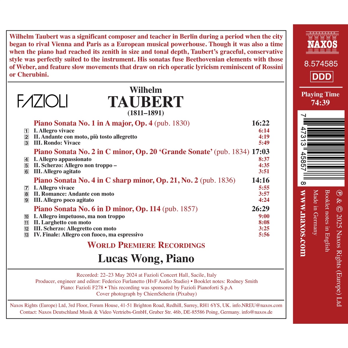 Wilhelm Taubert war ein bedeutender Komponist und Lehrer in Berlin, als die Stadt begann, Wien und Paris als europäische Musikmetropole Konkurrenz zu machen. Obwohl zu dieser Zeit auch das Klavier seinen Höhepunkt in Größe und Klangfülle erreicht hatte, passte Tauberts anmutiger, konservativer Stil perfekt zu diesem Instrument. Seine Sonaten verbinden Elemente Beethovens mit denen von Carl Maria von Weber und zeichnen sich durch langsame Sätze aus, die an die reichhaltige Opernlyrik von Gioachino Rossini oder Luigi Cherubini erinnern. Der kanadische Pianist Dr. Lucas Wong ist als Solist, Kammermusiker, Pädagoge und Korrepetitor tätig und hat bereits Werke von Claude Debussy, Emmanuel Chabrier, François Couperin und Jean-Philippe Rameau aufgenommen.