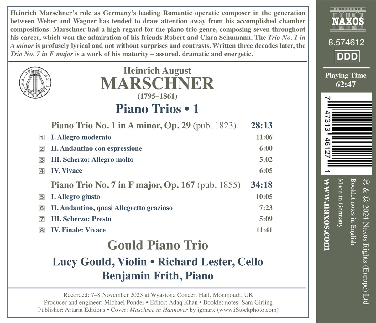 Heinrich Marschners Rolle als führender deutscher Komponist romantischer Opern in der Generation zwischen Weber und Wagner hat dazu geführt, dass seine vollendeten Kammerkompositionen weniger Beachtung finden. Marschner schätzte das Genre des Klaviertrios sehr und komponierte im Laufe seiner Karriere sieben davon, die die Bewunderung seiner Freunde Robert und Clara Schumann ernteten. Das Trio Nr. 1 in a-Moll ist überaus lyrisch und nicht ohne Überraschungen und Kontraste. Das Gould Piano Trio ist seit über einem Vierteljahrhundert an der Spitze der internationalen Kammermusikszene. Es wurde mit dem ersten Preis beim Melbourne International Chamber Music Competition ausgezeichnet und war Teil der „Rising Stars“-Initiative der European Concert Hall Organisation. Sein Debut an der New Yorker Weill Recital Hall wurde von der Kritik sehr positiv aufgenommen. Bei seinen zahlreichen Auftritten in der Londoner Wigmore Hall hat es unter anderem die vollständigen Klaviertrios von Dvořák, Mendelssohn, Schubert und Beethoven aufgeführt.