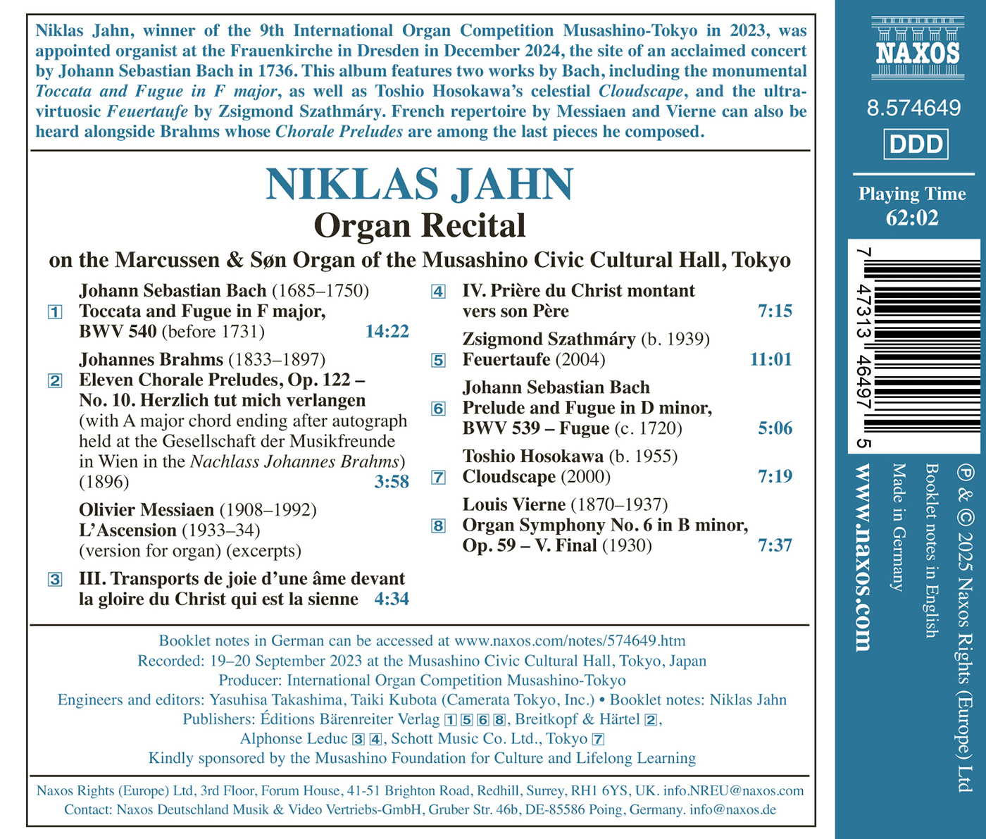 Niklas Jahn, Gewinner des 9. Internationalen Orgelwettbewerbs Musashino-Tokyo 2023, wurde im Dezember 2024 zum Organisten an der Frauenkirche in Dresden ernannt, wo Johann Sebastian Bach 1736 sein gefeiertes Konzert gab. Dieses Album enthält zwei Werke von Bach, darunter die monumentale „Toccata und Fuge in F-Dur“, sowie Toshio Hosokawas himmlisches „Cloudscape“ und das virtuose „Feuertaufe“ von Zsigmond Szathmáry. Neben Johannes Brahms, dessen „Choralvorspiele“ zu seinen letzten Kompositionen zählen, sind auch französische Werke von Olivier Messiaen und Louis Vierne zu hören. Niklas Jahn wurde 1996 in Fulda geboren, studierte Kirchenmusik, Orgelimprovisation und Chorleitung in Mainz und Freiburg und ist derzeit einer der spannendsten jungen Organisten. Er ist Preisträger zahlreicher international renommierter Orgelwettbewerbe, darunter der 32. St Albans International Organ Festival (Kategorie Orgelimprovisation, Erster Preis).