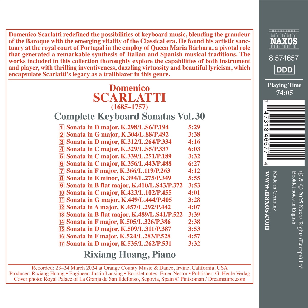 Domenico Scarlatti definierte die Möglichkeiten der Tastenmusik neu, indem er die Erhabenheit des Barock mit der aufkommenden Vitalität der Klassik verband. Er fand seine künstlerische Zuflucht am portugiesischen Königshof, wo er im Dienste von Königin Maria Bárbara stand. Diese Schlüsselrolle führte zu einer bemerkenswerten Synthese italienischer und spanischer Musiktraditionen. Die im 30. Teil der vollständigen Klaviersonaten enthaltenen Werke erforschen die Möglichkeiten von Instrument und Spieler gründlich, mit aufregendem Erfindungsreichtum, schillernder Virtuosität und wunderschöner Lyrik, die Scarlattis Vermächtnis als Wegbereiter in diesem Genre verkörpern. Rixiang Huang gewann den ersten Preis beim Internationalen Chopin-Klavierwettbewerb 2021 in Hartford sowie beim Internationalen Liszt-Klavierwettbewerb 2021 in Los Angeles und ist ein vielbeachteter Steinway-Künstler, der mit Auftritten auf vier Kontinenten das Publikum in seinen Bann gezogen hat.