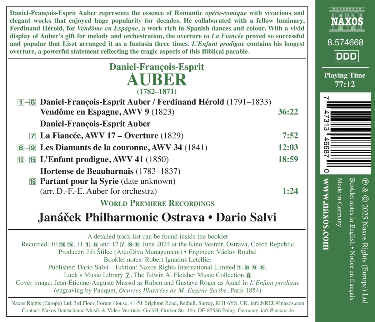 Daniel-François-Esprit Auber verkörpert mit seinen lebhaften und eleganten Werken, die sich jahrzehntelang großer Beliebtheit erfreuten, die Essenz der romantischen Opéra-comique. Für „Vendôme en Espagne“, ein Werk voller spanischer Tänze und Farben, arbeitete er mit seinem Kollegen Ferdinand Hérold zusammen. Die Ouvertüre zu „La Fiancée“ zeugt eindrucksvoll von Aubers Begabung für Melodie und Orchestrierung und war so erfolgreich und beliebt, dass Liszt sie dreimal als Fantasie arrangierte. „L'Enfant prodigue“ enthält seine längste Ouvertüre, ein kraftvolles Statement, das die tragischen Aspekte dieser biblischen Parabel widerspiegelt (‚Der verlorene Sohn‘ aus dem Lukas-Evagelium). Der Dirigent Dario Salvi arbeitet mit Naxos an einer Reihe von Aufnahmen romantischer Ballette, darunter Werke von Ludwig Minkus, Cesare Pugni, Adolphe Adam und anderen. Er leitet das Janáček Philharmonic Orchestra.