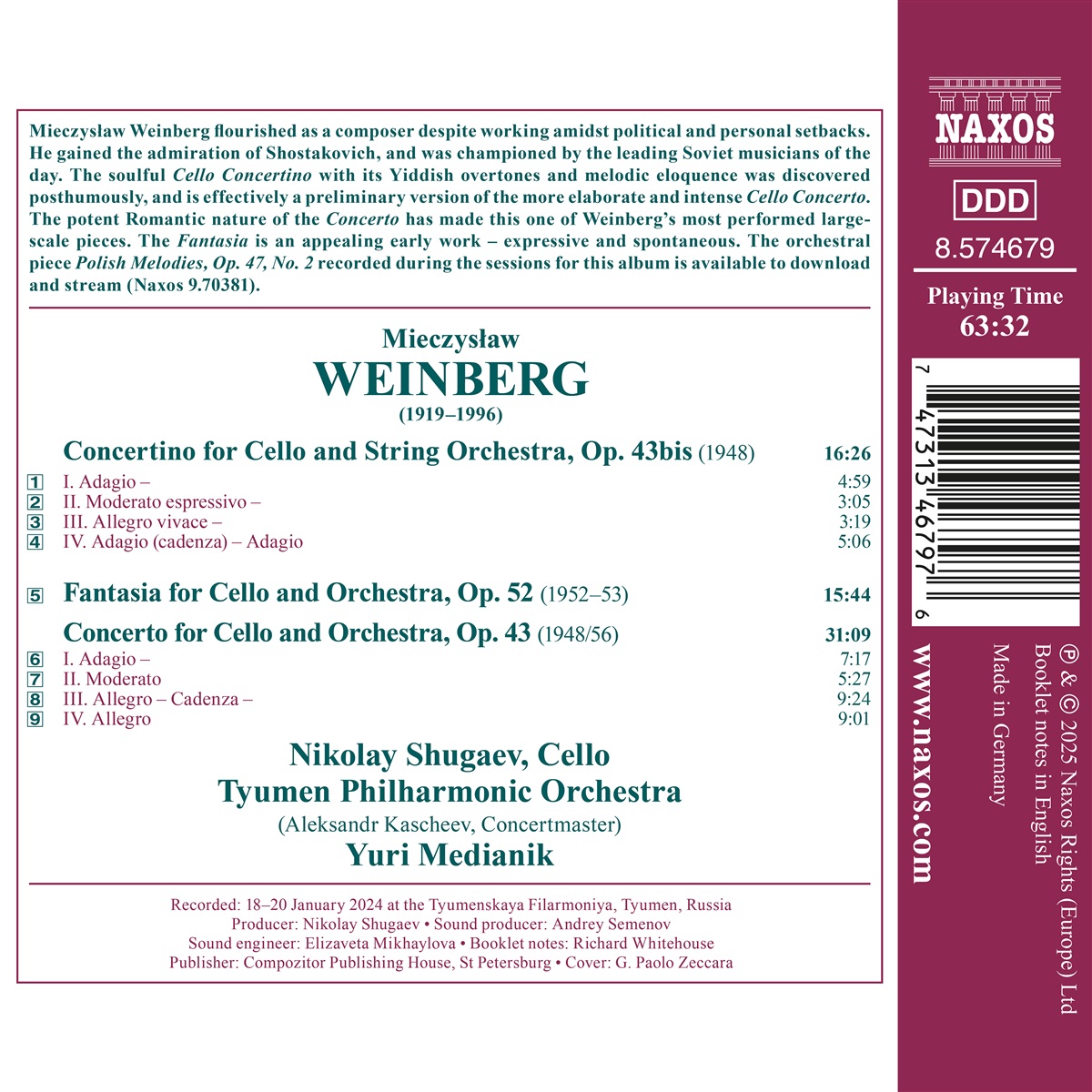 Mieczysław Weinberg konnte sich als Komponist entfalten, obwohl er mit politischen und persönlichen Rückschlägen zu kämpfen hatte. Er erlangte die Bewunderung von Schostakowitsch und wurde von den führenden sowjetischen Musikern der damaligen Zeit gefördert. Das gefühlvolle Cello Concertino mit seinen jiddischen Obertönen und seiner melodischen Eloquenz wurde erst posthum entdeckt und ist im Grunde eine Vorabversion des ausgefeilteren und intensiveren Cellokonzerts. Das kraftvolle romantische Konzert wurde zu einem der meistgespielten großformatigen Stücke Weinbergs. Die Fantasia ist ein ansprechendes Frühwerk – ausdrucksstark und spontan. Das Orchesterstück „Polish Melodies“, Op. 47, Nr. 2, das während der Arbeiten an diesem Album aufgenommen wurde, steht zusätzlich zum Download und Streaming zur Verfügung. Yuri Medianik ist seit 2022 künstlerischer Leiter und Chefdirigent des Tyumen Philharmonic Orchestra und als angesehener Dirigent und Multiinstrumentalist (Violine, Bajan, Bandoneon) bekannt. Auftritte vor den Präsidenten von 15 Ländern zählen zu seinen Erfolgen. Seit 2015 leitet er die Novaya Opera in Moskau und ist seit 2021 Chefdirigent des Staatlichen Akademischen Opern- und Balletttheaters Nischni Nowgorod. Der Cellist Nikolay Shugaev hat mit Orchestern wie dem Staatlichen Akademischen Sinfonieorchester St. Petersburg, dem Orchestra Simfonică București, der Norrlandsoperan, der Royal Stockholm Philharmonic Orchestra Academy und dem Orquesta Sinfónica Nacional de Cuba zusammengearbeitet und ist bei internationalen Festivals wie Ceresio Estate, Società dei Concerti di Milano und dem Lucerne Festival aufgetreten.