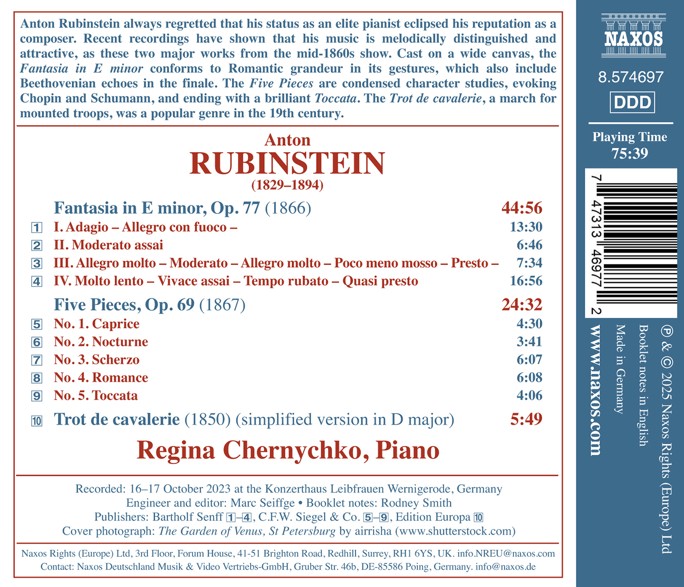 Anton Rubinstein bedauerte stets, dass sein Status als Elitepianist seinen Ruf als Komponist überschattete. Jüngste Aufnahmen haben gezeigt, dass seine Musik melodisch herausragend und attraktiv ist, wie diese beiden bedeutenden Werke aus der Mitte der 1860er Jahre belegen. Die „Fantasia in e-Moll“ ist breit angelegt und entspricht in ihrer Gestik der romantischen Grandezza, die im Finale auch Anklänge an Beethoven enthält. Die „Fünf Stücke“ sind komprimierte Charakterstudien, die an Frédéric Chopin und Robert Schumann erinnern und mit einer brillanten „Toccata“ enden. Der „Trot de cavalerie“, ein Marsch für berittene Truppen, war im 19. Jahrhundert ein beliebtes Genre. Regina Chernychko wurde in eine Musikerfamilie in Charkiw (Ukraine) geboren. Sie gewann den 60. Internationalen Klavierwettbewerb ‚Maria Canals‘ sowie zahlreiche weitere Wettbewerbe, darunter den Internationalen Klavierwettbewerb ‚Ricard Viñes# in Lleida (Spanien). Sie ist außerdem Preisträgerin des Chopin-Preises in Rom (Italien), des Delia-Steinberg-Wettbewerbs in Madrid (Spanien) und des Wettbewerbs „Junge Musiker” in Enschede (Niederlande).