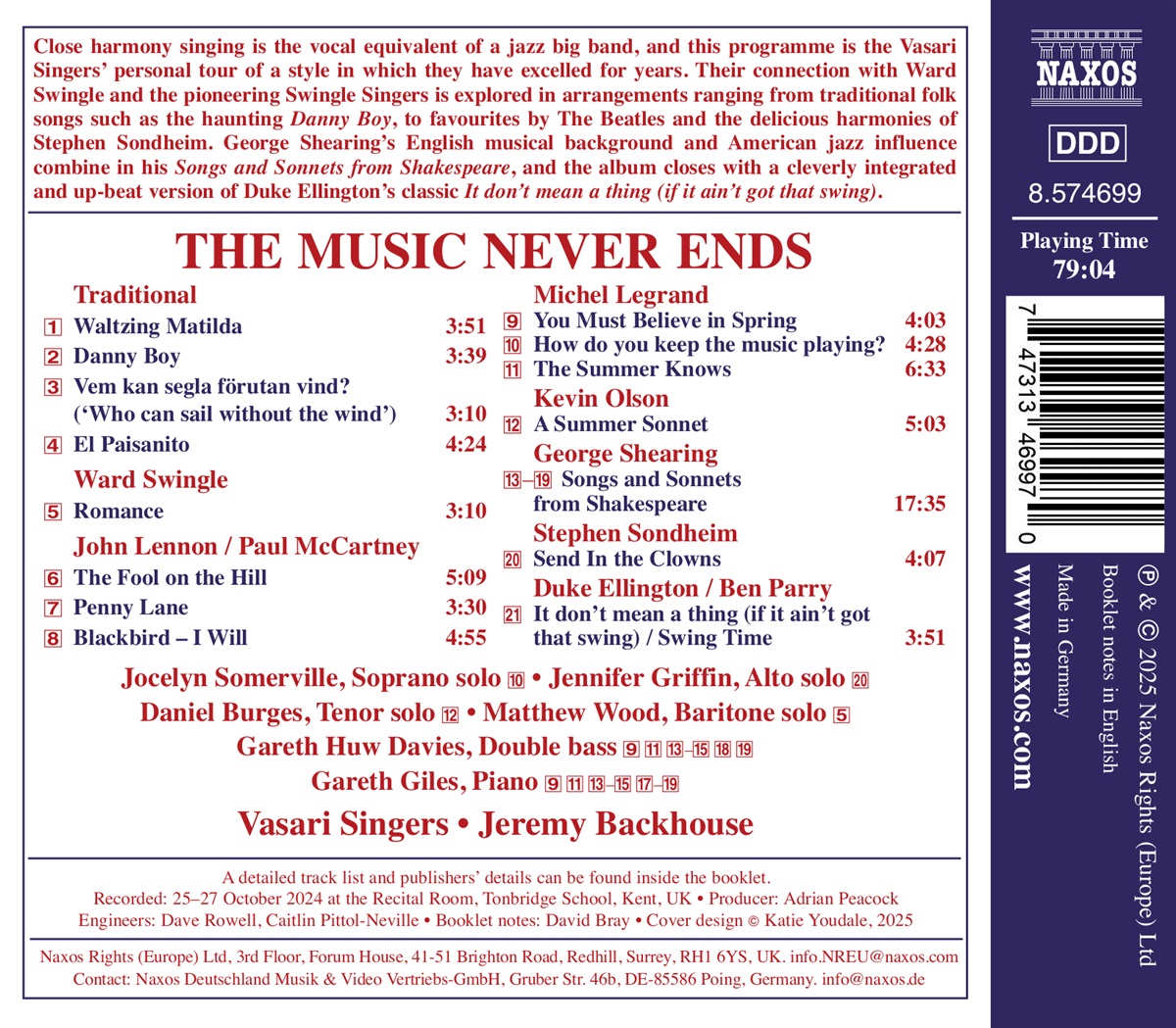 Close Harmony Singing ist das vokale Äquivalent einer Jazz-Bigband, und dieses Programm ist die persönliche Tournee der Vasari Singers durch einen Stil, in dem sie sich seit Jahren auszeichnen. Ihre Verbindung zu Ward Swingle und den bahnbrechenden Swingle Singers wird in Arrangements erkundet, die von traditionellen Volksliedern wie dem eindringlichen Danny Boy bis hin zu Favoriten der Beatles und den köstlichen Harmonien von Stephen Sondheim reichen. George Shearings englisch musikalischer Hintergrund und amerikanischer Jazz-Einfluss verbinden sich in seinen „Songs and Sonnets from Shakespeare“, und das Album schließt mit einer geschickt integrierten und peppigen Version von Duke Ellingtons Klassiker „It don't mean a thing (if it ain't got that swing)“.