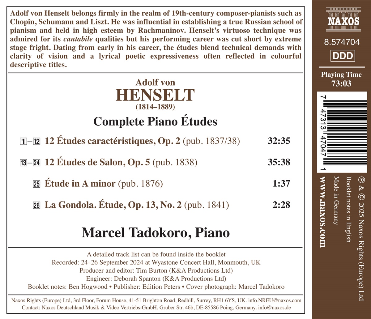 Adolf von Henselt gehört eindeutig in die Riege der Komponisten und Pianisten des 19. Jahrhunderts wie Chopin, Schumann und Liszt. Er war maßgeblich an der Etablierung einer echten russischen Klavierschule beteiligt und wurde von Rachmaninow hoch geschätzt. Henselts virtuose Technik war wegen ihrer kantablen Qualitäten bewundert, doch seine Karriere als Konzertpianist wurde durch extremes Lampenfieber beeinträchtigt. Die Etüden aus seiner frühen Schaffensphase verbinden technische Anforderungen mit klarer Vision und einer lyrisch-poetischen Ausdruckskraft, die sich oft in farbenfrohen, beschreibenden Titeln widerspiegelt. Marcel Tadokoro wurde in Fukuoka, Japan, geboren. Er begann im Alter von acht Jahren in Japan mit dem Klavierspiel, bevor er in Paris am Conservatoire National Supérieur de Musique et de Danse (CNSMDP) und am Conservatoire à Rayonnement Régional bei Jean-François Heisser, Florent Boffard und Olivier Gardon studierte. Nach seinem Master-Abschluss am CNSMDP setzte er sein Studium mit einem Stipendium bei Rena Shereshevskaya an der École Normale de Musique de Paris „Alfred Cortot“ fort. Tadokoro gewann renommierte Preise bei internationalen Wettbewerben, darunter den John Giordano Jury Chairman Discretionary Award beim Van Cliburn International Piano Competition 2022 und den dritten Preis beim 20. Paloma O'Shea International Piano Competition im selben Jahr. Außerdem war er Finalist beim Concours musical international de Montréal 2021.