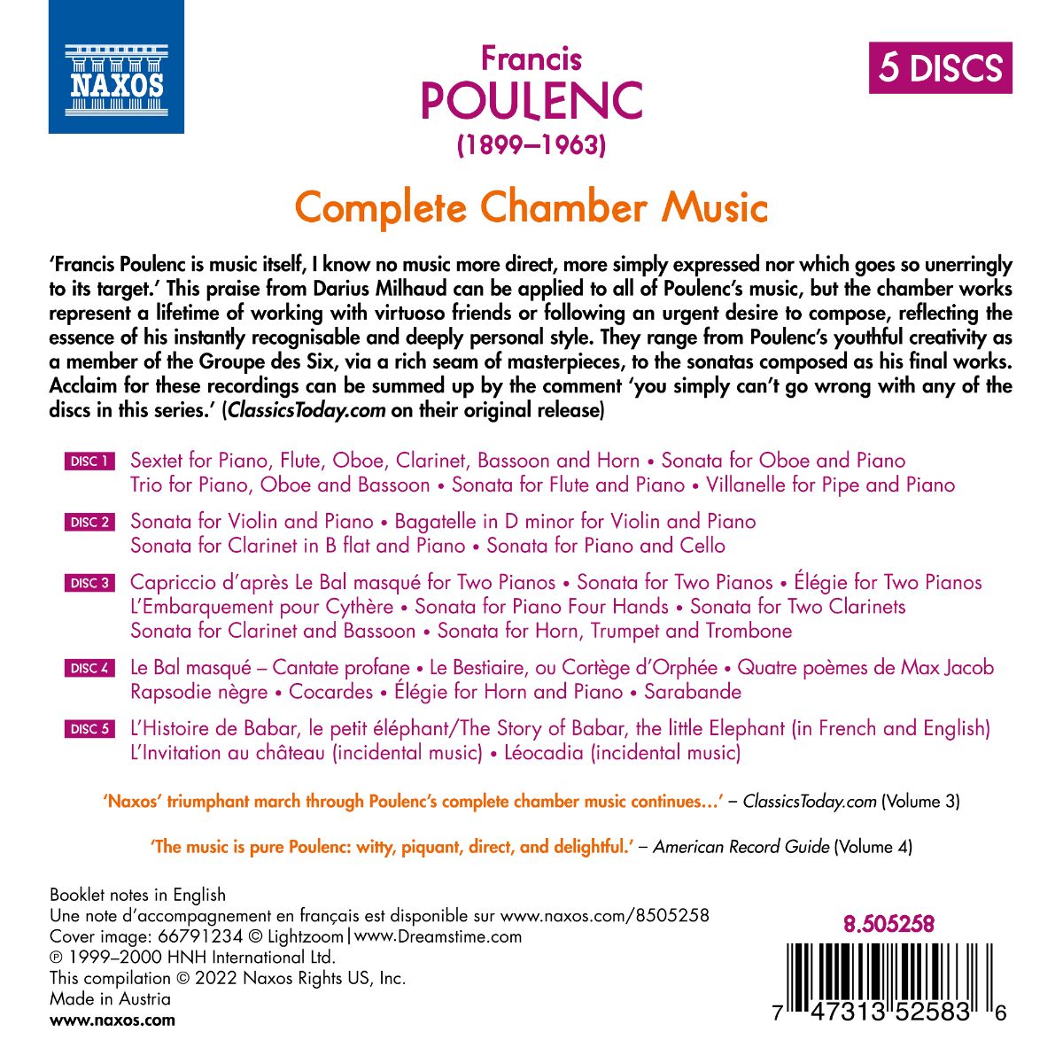 „Francis Poulenc ist die Musik selbst, ich kenne keine Musik, die direkter und einfacher so treffsicher zum Ziel führt.“ Dieses Lob von Darius Milhaud kann auf die gesamte Musik Poulencs angewandt werden, aber speziell seine Kammermusik steht für den drängenden Impuls etwas Unmittelbares, Unverfälschtes zu komponieren. Poulencs Kammermusik spiegelt die Essenz seines sofort erkennbaren und zutiefst persönlichen Stils wider. Die hier zusammengefassten Werke reichen von seinem jugendlichen Schaffen als Mitglied der ‚Groupe des Six‘ über seine Meisterwerke bis hin zu den späten Sonaten.