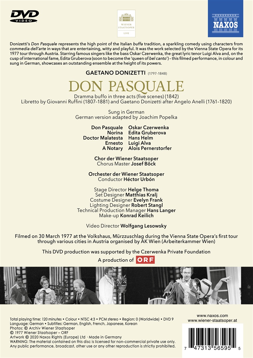 Aus dem Archiv der Wiener Staatsoper stammt die vorliegende Aufführung des „Don Pasquale“ aus dem Jahre 1977, aufgezeichnet in Mürzzuschlag in der Steiermark. Diese äußerst farbenprächtige und rasant inszenierte Produktion wurde für eine Tour der Staatsoper durch die österreichischen Bundesländer gewählt und in deutscher Sprache gesungen. Die Sängerliste umfasst einige der besten Mitglieder des damaligen Ensembles, u. a. Edita Gruberova, Luigi Alva und Okar Czerwenka in der Titelrolle. Es spielt das Orchester der Wiener Staatsoper, unter der Leitung von Héctor Urbón.