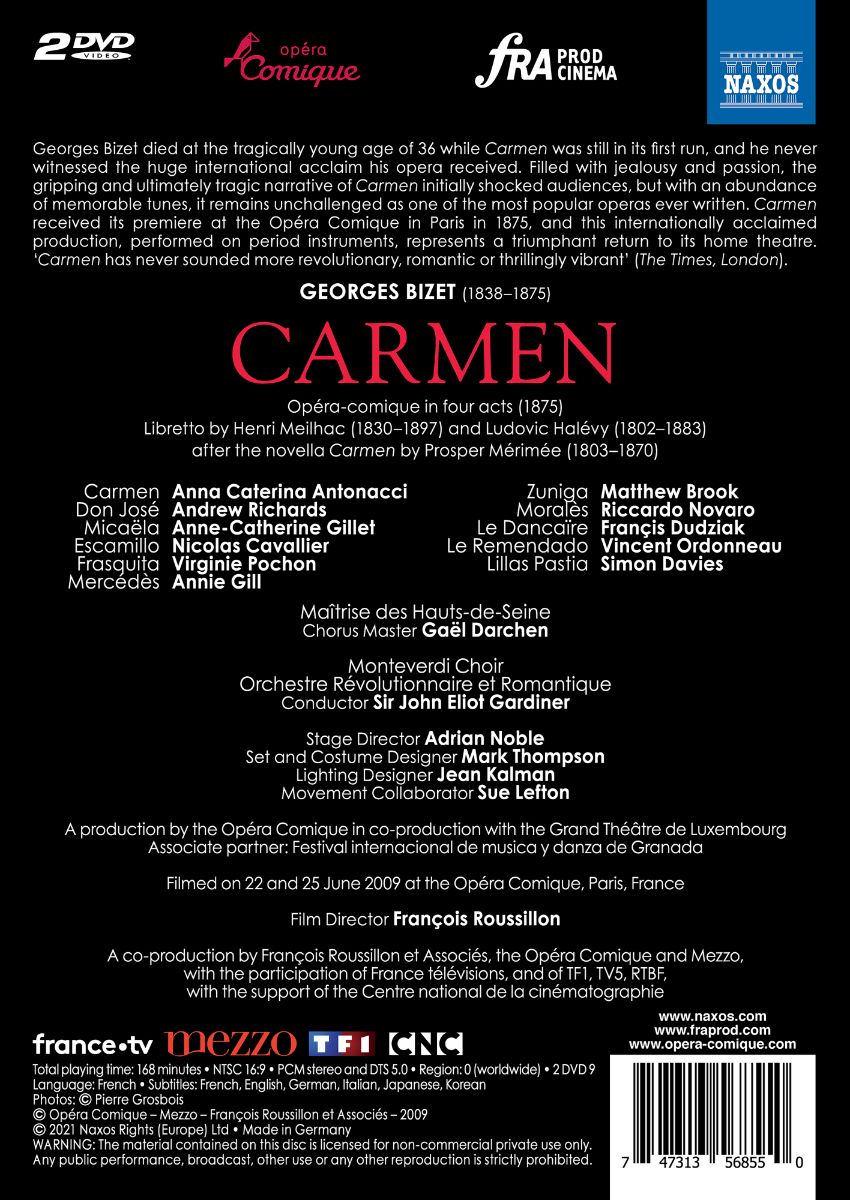 George Bizets „Carmen“ wurde bei der Premiere 1875 an der Opéra Comique in Paris äußerst unterkühlt aufgenommen. Der Komponist starb drei Monate danach und erlebte den immensen Erfolg seiner Oper nicht mehr. 2009 entstand am selben Ort eine denkwürdige Inszenierung unter der Regie von Adrian Noble mit einer Spitzenbesetzung, allen voran Anna Caterina Antonacci in der Titelrolle. Das Orchestre Révolutionnaire et Romantique unter John Eliot Gardiner, das seinem Namen selten gerechter wurde, als in diesem zutiefst revolutionären und romantischen Meisterwerk, sorgt für eine mustergültige Umsetzung der unsterblichen Musik Bizets.