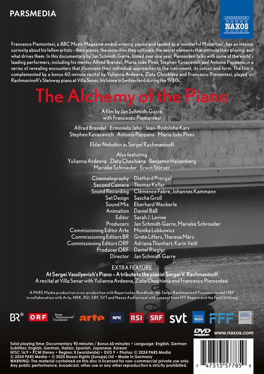 Pianist Francesco Piemontesi, Gewinner des Preises des BBC Music Magazine und als „wunderbarer Mozartianer“ gepriesen, ist sehr neugierig auf seine Künstlerkollegen – auf ihre Klaviere, die Klänge, die sie kultivieren, die verborgenen Elemente, die ihr Spiel beleben, und was sie antreibt. In diesem Dokumentarfilm von Jan Schmidt-Garre, der über ein Jahr lang gedreht wurde, spricht Piemontesi mit einigen der weltweit führenden Interpreten, unter anderem seinen Mentor Alfred Brendel, Maria João Pires, Stephen Kovacevich und Antonio Pappano, in einer Reihe aufschlussreicher Begegnungen, die ihre individuellen Herangehensweisen an das Instrument, sein Charakter und seine Form beleuchten. Der Film wird durch ein 60-minütiges Bonuskonzert von Yulianna Avdeeva, Zlata Chochieva und Francesco Piemontesi ergänzt, das auf Rachmaninoffs Steinway-Flügel in der Villa Senar, seinem Haus in der Schweiz in den 1930er Jahren, gespielt wurde. Der Regisseur Jan Schmidt-Garre studierte Dirigieren und Musiktheorie bei Sergiu Celibidache in Mainz, München und Paris. Er ist selbst auch Opernregisseur.