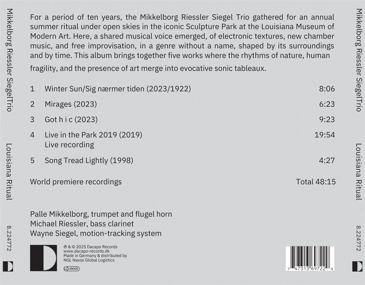 Zehn Jahre lang traf sich das Trio Mikkelborg Riessler Siegel zu einem jährlichen Sommerritual unter freiem Himmel im legendären Skulpturenpark des Louisiana Museum of Modern Art in Kopenhagen. Hier entstand eine gemeinsame musikalische Stimme aus elektronischen Texturen, neuer Kammermusik und freier Improvisation, in einem Genre ohne Namen, geprägt von seiner Umgebung und der Zeit. Dieses Album vereint fünf Werke, in denen die Rhythmen der Natur, die Zerbrechlichkeit des Menschen und die Präsenz der Kunst zu eindrucksvollen Klangbildern verschmelzen. Sie reichen von luftigen und meditativen Werken bis hin zu energiegeladenen Experimenten. „Winter Sun“ zitiert ein berühmtes dänisches Lied, „Sig nærmer tiden“, das Zugvögel als Metapher für den Tod und die Vergänglichkeit des menschlichen Lebens verwendet. Der Trompeter Palle Mikkelborg nimmt mit seinem unschätzbaren Einfluss auf die dänische Musik und seinen Kooperationen mit internationalen Stars eine Sonderstellung in der dänischen Jazzszene ein. Der deutsche Musiker und Komponist Michael Riessler bewegt sich mühelos zwischen Jazz, zeitgenössischer Musik und Folklore. Der in Amerika geborene Komponist Wayne Siegel hat sich mit seinem innovativen Einsatz elektronischer Elemente und seiner Inspiration durch den amerikanischen Minimalismus und die amerikanische Volksmusik als frischer Wind in der dänischen Musikszene erwiesen. Das Cover-Artwork zeigt ein Foto von Poul Gernes' Pyramide (1967) aus dem Louisiana Museum Park.