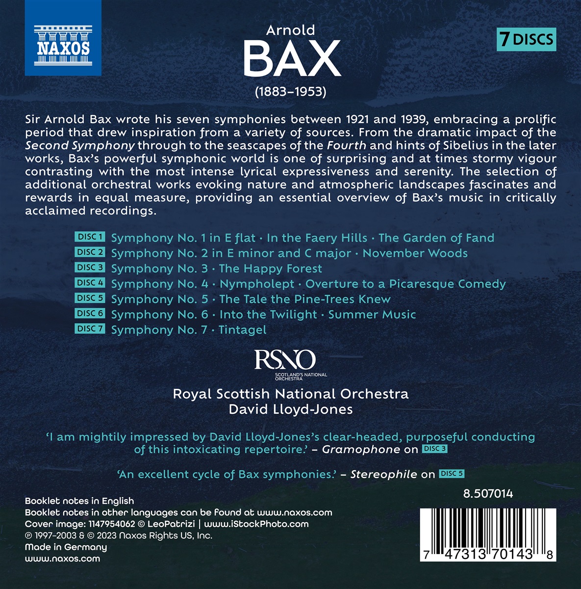 Arnold Bax komponierte seine sieben Sinfonien zwischen 1921 und 1939 – eine sehr fruchtbare Periode in seinem Leben. Sein kraftvolles sinfonisches Werk kontrastiert intensive lyrische Ausdruckskraft mit manchmal geradezu stürmischer Lebhaftigkeit. Die Aufnahmen mit dem RSNO kombinieren die Sinfonien mit einigen Orchesterwerken, die Natur und atmosphärische Landschaftsbilder heraufbeschwören, und insgesamt einen guten Überblick über Bax' Musik bieten. Natürlich ist auch sein bekanntestes Werk vertreten, die sinfonische Dichtung „Tintagel“.
