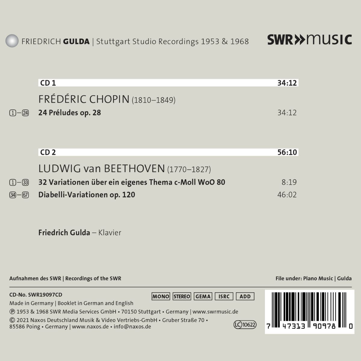 Der geniale Rhythmiker, kompromisslose Bach-Interpret und Jazzer Friedrich Gulda ist tatsächlich bei Chopin sehr gut aufgehoben. Werke Chopins tauchen in Guldas Konzertprogrammen sehr früh auf. Seine rhythmische Strenge, kantable Zärtlichkeit und der kontrollierte Ausbruch machen ihn einmalig. Neben Bach und Mozart war Beethoven eine wichtige Säule in Guldas Programmen. Dabei empfahl er sich nicht nur als vorzüglicher Interpret der Sonaten, sondern war auch den Variationszyklen zugetan. Seine Aufnahmen der „Diabelli-Variationen“ gelten immer noch als unerreicht.