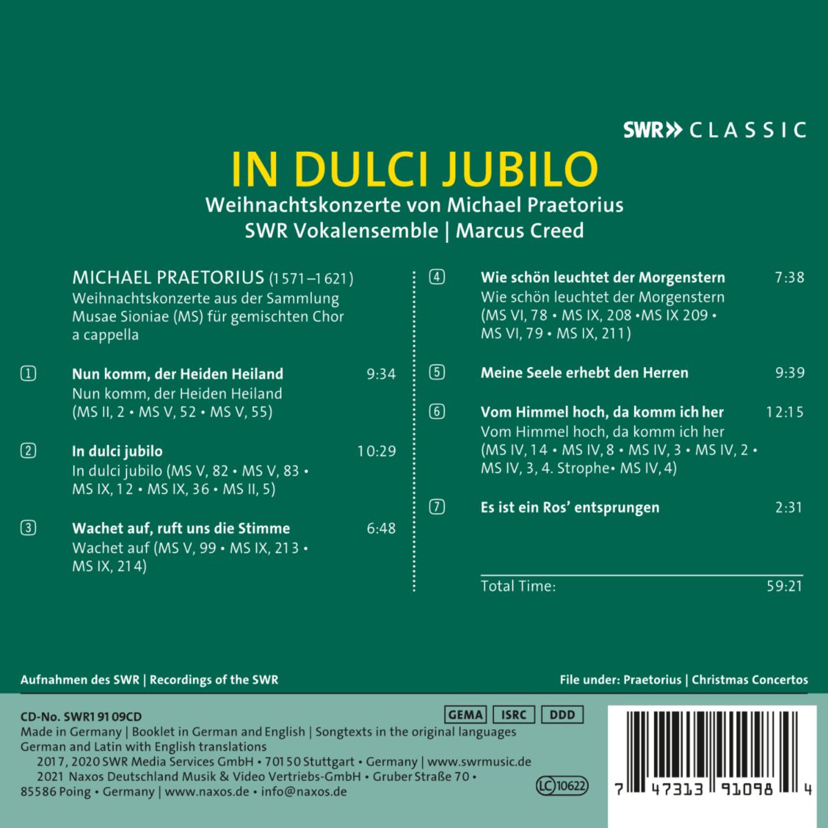 Marcus Creed hat für das vorliegende Album mehrere Bände der zentralen „Musae Sioniae“ Michael Praetorius‘ sowie weitere Drucke seiner Werke durchforstet und seine beliebtesten Weihnachtslieder in unterschiedlichen Besetzungen ausgewählt. Vier- und fünfstimmige Sätze mit der Liedmelodie in der Oberstimme stehen neben kunstvollen Bicinien und Tricinien, in denen nur zwei oder drei gleiche Stimmen eingesetzt werden. Zu hören ist aber auch prächtige Doppel- und Dreichörigkeit. Das Ergebnis ist ein ungewöhnlich abwechslungsreiches Weihnachtsalbum.