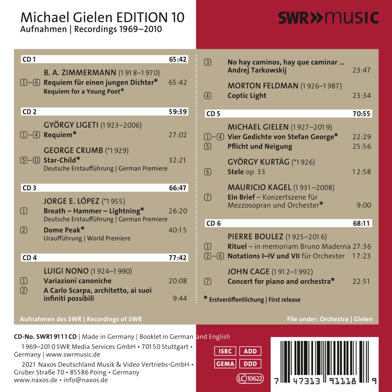 Sechs Jahre nach ihrer Initialisierung kommt die „Michael Gielen EDITION“ mit der hier vorliegenden zehnten Veröffentlichung zum Abschluss. Volume 10 enthält mehr als sieben Stunden Orchesterrepertoire mit Höhepunkten der Nachkriegsmoderne, einschließlich zweier Kompositionen von Gielen selbst. Viele Aufnahmen werden hier zum ersten Mal veröffentlicht: Kompositionen von Bernd Alois Zimmermann, György Ligeti, George Crumb, Jorge Lopez, Luigi Nono, Morton Feldman, György Kurtag, Mauricio Kagel, Pierre Boulez und John Cage, ein Who-is-who der Nachkriegsavantgarde – und mittendrin: Maestro Michael Gielen.