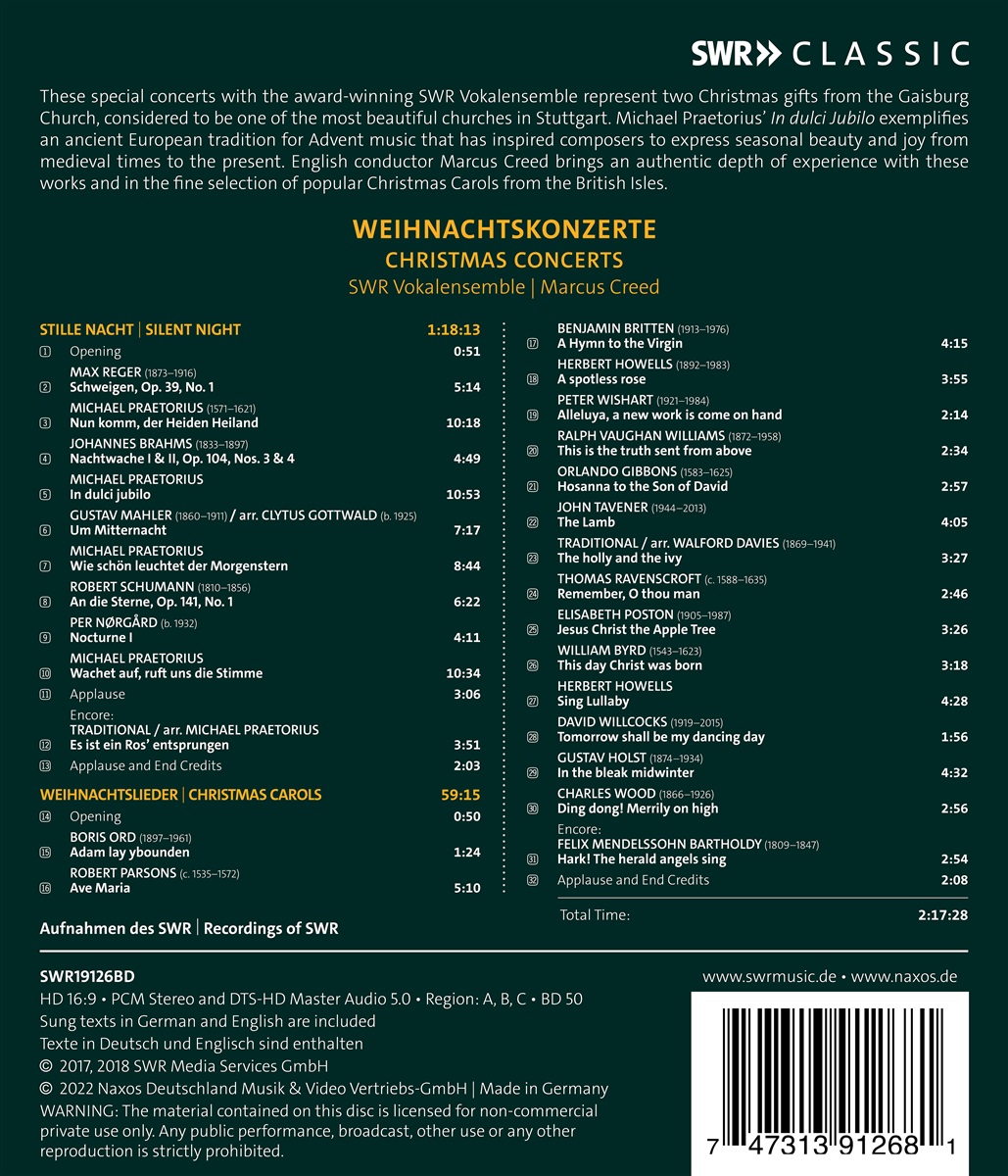 Die hier zusammengefassten Konzerte (aus den Adventswochen 2017 und 2018) mit dem preisgekrönten SWR Vokalensemble wurden in der Gaisburger Kirche mitgeschnitten, die als eine der die als eine der schönsten Kirchen Stuttgarts gilt. Das erste Konzert „Stille Nacht“ widmet sich der (vornehmlich) deutschen Tradition, die mit Michael Praetorius begann, um später dann von den Romantikern Robert Schumann, Johannes Brahms und Gustav Mahler aufgegriffen zu werden. Das zweite Konzert „Christmas Carols“ fasst (vornehmlich) Weihnachtslieder der Britischen Inseln zusammen.