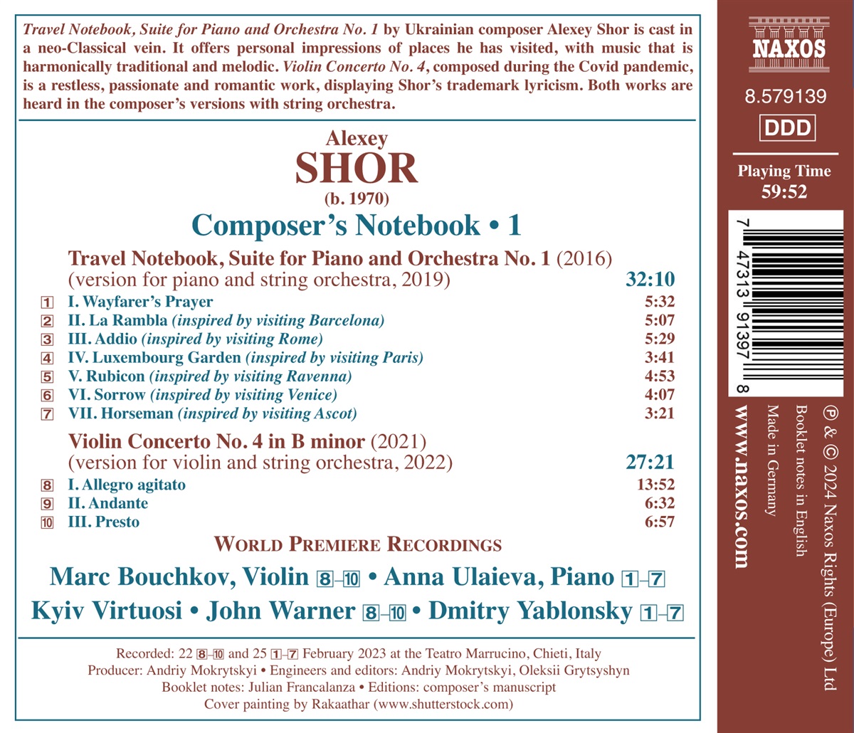 „Travel Notebook“, „Suite for Piano“ und „Orchestra No. 1“ des ukrainischen Komponisten Alexey Shor sind in einem neoklassizistischen Stil gehalten. Sie bieten persönliche Eindrücke von Orten, die er besucht hat, die Musik ist harmonisch traditionell und melodisch. Das Violinkonzert Nr. 4, das während der Covid-Pandemie komponiert wurde, ist ein unruhiges, leidenschaftliches und romantisches Werk, das Shors typische lyrische Note trägt. Die Werke des in der Ukraine geborenen Komponisten Alexey Shor wurden an renommierten Veranstaltungsorten auf der ganzen Welt aufgeführt, darunter der Wiener Musikverein, die Philharmonie Berlin, die Carnegie Hall, das Moskauer Konservatorium, das Concertgebouw und die Wigmore Hall. Die Ouvertüre zu seinem Ballett „Crystal Palace“ wurde bei der Verleihung der 40. Gramophone Classical Music Awards aufgeführt. Der Violinist Marc Bouchkov gewann eine Goldmedaille beim Internationalen Wettbewerb von Montreal und eine Silbermedaille beim Internationalen Tschaikowski-Wettbewerb. Die ukrainisch-österreichische Pianistin Anna Ulaieva hat ebenfalls zahlreiche Preise gewonnen, unterrichtet an der Kunstuniversität Graz und hat bereits mit namhaften Musikkollegen kooperiert wie dem Oxford Philharmonic Orchestra und dem National Symphony Orchestra of Ukraine sowie den Dirigenten Dmitry Jablonski, Marios Papadopoulos und Christian Jarvi.