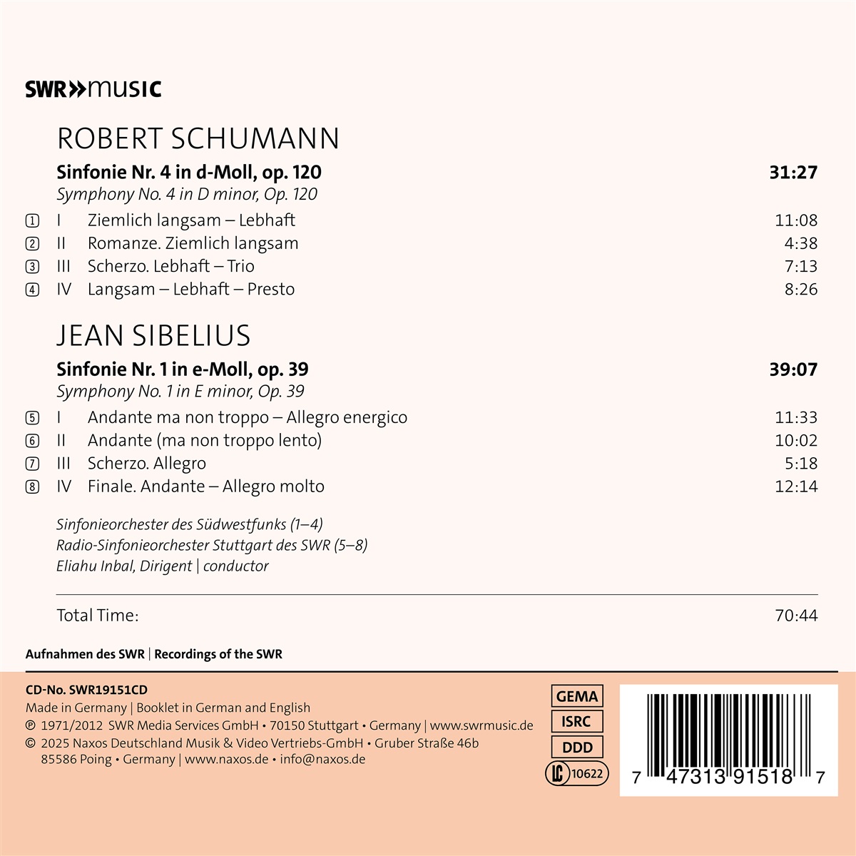 Trotz ihrer Unterschiede – kultureller Hintergrund, Leben in unterschiedlichen Epochen – gibt es einige Gemeinsamkeiten zwischen Robert Schumann und Jean Sibelius hinsichtlich ihrer Entwicklung zum Sinfoniker. Beide waren schon angesehene Komponisten als sie mit der Arbeit an ihren Sinfonien begannen. Robert Schumanns Vierte Sinfonie ist eigentlich seine zweite, wurde aber später noch einmal stark überarbeitet und liegt auf diesem Album in der neueren Fassung vor. Jean Sibelius’ Erste Sinfonie war gleichzeitig auch sein erstes Werk, das ihm internationalen Erfolg einbrachte, da das Orchester der Philharmonischen Gesellschaft Helsinki mit Werken des Komponisten eine Tournee durch Schweden, Dänemark, Deutschland, die Niederlande und Belgien unternahm, die in einem Auftritt auf der Pariser Weltausstellung gipfelte. Als Gewinner des internationalen Dirigentenwettbewerbes ‚Guido Cantelli‘ wurde Eliahu Inbal bereits im Alter von 26 Jahren gefragter Gastdirigent bei den führenden Orchestern weltweit. Im Laufe der Jahre wirkte er als Chefdirigent des Sinfonieorchesters des Hessischen Rundfunks Frankfurt, des Orchestra del Teatro la Fenice, des Orchestra Sinfonica Nazionale della RAI Turino, des Konzerthausorchesters Berlin, der Tschechischen Philharmonie und des Tokyo Metropolitan Symphony Orchestra.