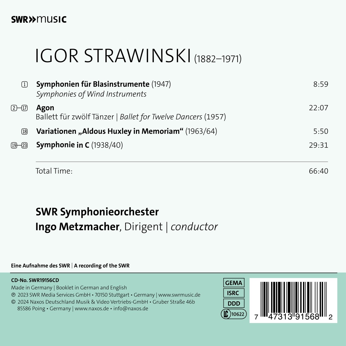 Das vorliegende Album enthält Aufführungen weniger aufgenommener Orchesterwerke von Igor Strawinski. Sie zeigen die Vielseitigkeit des russischen Komponisten, der nie Anhänger einer bestimmten Ausdrucksästhetik war. Im Gegenteil, er betrachtete das Komponieren als intellektuelles Spiel, als einen Versuch, selbst erfundene musikalische Probleme zu lösen. Sein Konstruktivismus konnte sich an der italienischen Barockmusik entzünden, aber ebenso gut an den polyphonen Strukturen der Renaissance, am Jazz oder an den seriellen Tonkomplexen Anton Weberns. Ob als Operndirigent, Orchesterleiter, Festivalleiter oder Buchautor: Ingo Metzmacher engagiert sich konsequent für die Musik, insbesondere die des 20. und 21. Jahrhunderts. Er ist häufig Gastdirigent bei großen Orchestern wie den Wiener Philharmonikern, dem Cleveland Orchestra, dem Gewandhausorchester, den Wiener Symphonikern und dem Ensemble Modern sowie bei Opernhäusern und Festivals wie der Wiener Staatsoper, der Opéra National de Paris, dem Teatro alla Scala in Mailand, den Salzburger Festspielen und dem Festival dʼAix-en-Provence.