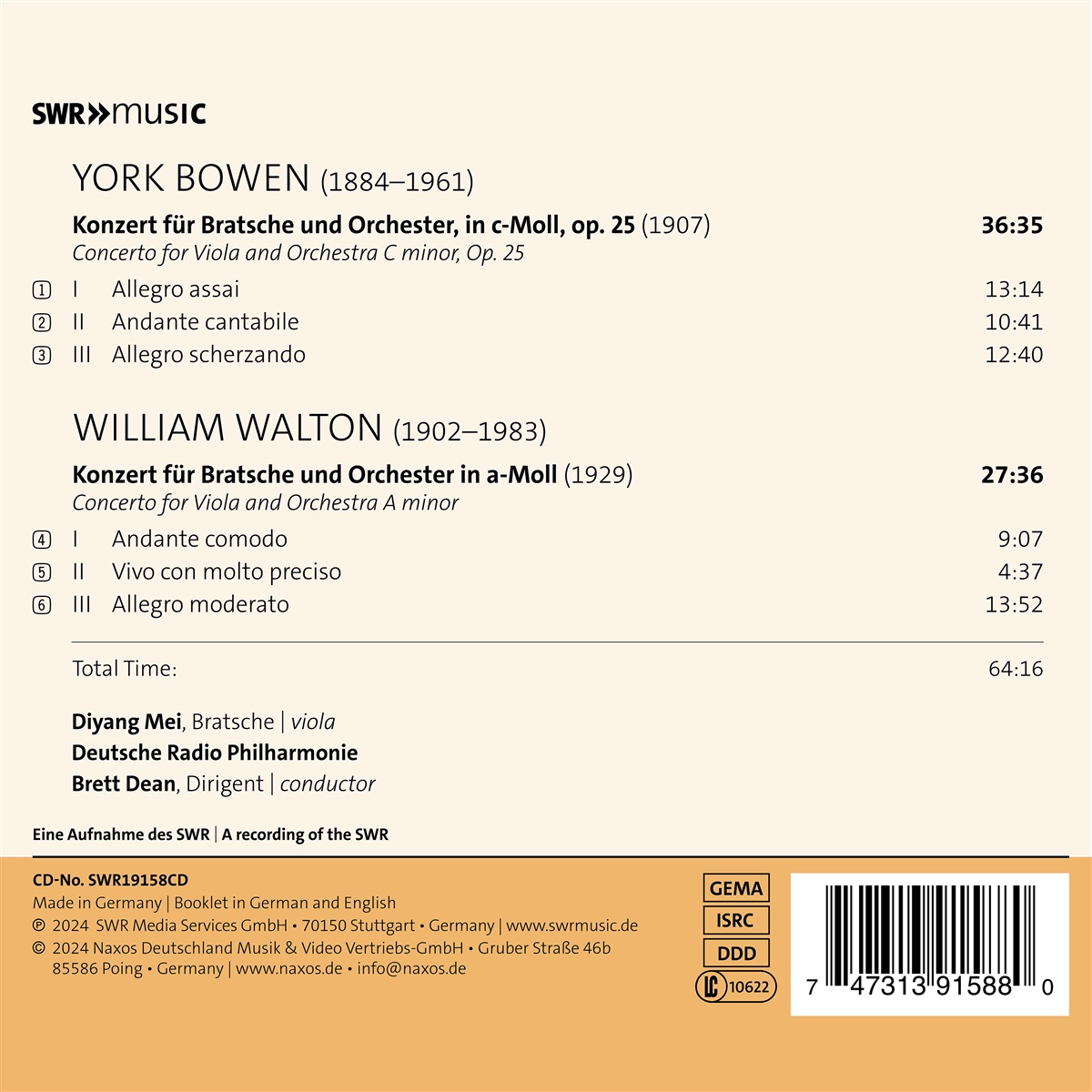 William Walton und Edwin York Bowen gehören zu den Tonsetzern, welche kaum einen bleibenden internationalen Durchbruch schaffen konnten. Auch der Bratsche kommt eine ähnliche Rolle zu. Ihre Qualitäten wurden von vielen Komponisten schlichtweg ignoriert, das solistische und konzertante Repertoire für dieses Instrument ist entsprechend schmal. Dem seinerzeit berühmten englischen Bratschist Lionel Tertis ist zu verdanken, dass Bowen und Walton die auf diesem Album zu hörenden Konzerte geschrieben haben. Das Ergebnis ist eine Bereicherung nicht nur für das Bratschen-Repertoire, sondern auch für alle Liebhaber der klassischen Musik. Der Bratschist Diyang Mei, erster Solo-Bratscher der Berliner Philharmoniker, hat seit seinem fulminanten Erfolg 2018 beim begehrten Internationalen ARD Musikwettbewerb seine internationale Karriere steil vorangetrieben. Als Solist trat er bereits mit dem Symphonieorchester des Bayerischen Rundfunks, dem SWR Symphonieorchester Stuttgart, dem Münchner Kammerorchester, dem Konzerthausorchester Berlin, dem Scottish Chamber Orchestra, den Münchner Symphonikern, der Deutschen Radio Philharmonie sowie bei den Festspielen Mecklenburg-Vorpommern, den Schwetzinger SWR Festspielen, beim Schwarzwald Musikfestival und beim Mozartfest in Würzburg auf. Als Dirigent steht ihm kein anderer als Brett Dean zur Seite, der als Bratschist, Komponist und Dirigent internationales Renommee genießt.