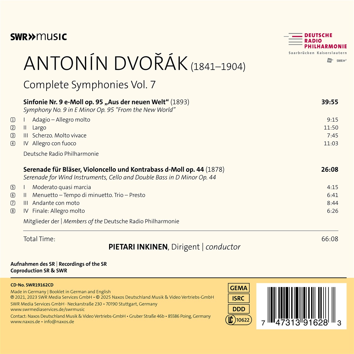 Die neunte Sinfonie, die Antonín Dvořák selbst mit „Aus der neuen Welt“ betitelte, war bei ihrer Uraufführung am 16.12.1893 in der New Yorker Carnegie Hall ein immenser Erfolg: „Die Zeitungen sagen, noch nie hatte ein Komponist einen solchen Triumph.“ Dabei war sie keinesfalls unumstritten – Dvořák war in die USA eingeladen worden mit dem klaren Auftrag, eine nationale amerikanische Musik zu schaffen. Er studierte also die Musik der indigenen Bevölkerung, der Nachfahren der Sklaven und der diversen anderen Einwohner und auf dieser Basis entstand die Sinfonie. Etliche Kritiker waren jedoch der Meinung, dass die Nr. 9 wenig zu tun hatte mit authentischer amerikanischer Musik. Das Werk blieb allerdings erhaben über solche Betrachtungen und gehört bis heute zu den beliebtesten Sinfonien aller Zeiten. Viele Jahre davor komponierte Dvořák die „Serenade für Blasinstrumente, Violoncello und Kontrabass in d-Moll“. Vermutlich war er durch Wolfgang Amadeus Mozarts „Gran Partita“ inspiriert, unter anderem die ungewöhnliche Besetzung von op. 44 – mit jeweils zwei Oboen, Klarinetten und Fagotten, einem Kontrafagott sowie drei Hörnern plus zwei Celli und Kontrabassi – ist ein starkes Indiz dafür. Der finnische Dirigent Pietari lnkinen leitet die Deutsche Radio Philharmonie seit 2017 – sie haben immer einen starken Fokus auf spätromantische Werke gelegt. Im Sommer 2025 gibt er die Chefposition auf, um sich verstärkt seinen internationalen Verpflichtungen widmen zu können. Er erhielt zahlreiche Auszeichnungen, darunter den Franco-Abbiati-Preis. Im Oktober 2023 erschien das filmische Portrait „Ein Taktstock und ein Reisepass – Pietari lnkinen Dirigent“. Bei dem vorliegenden Album handelt es sich um den letzten Teil der der Gesamteinspielung von Dvořáks Sinfonien.