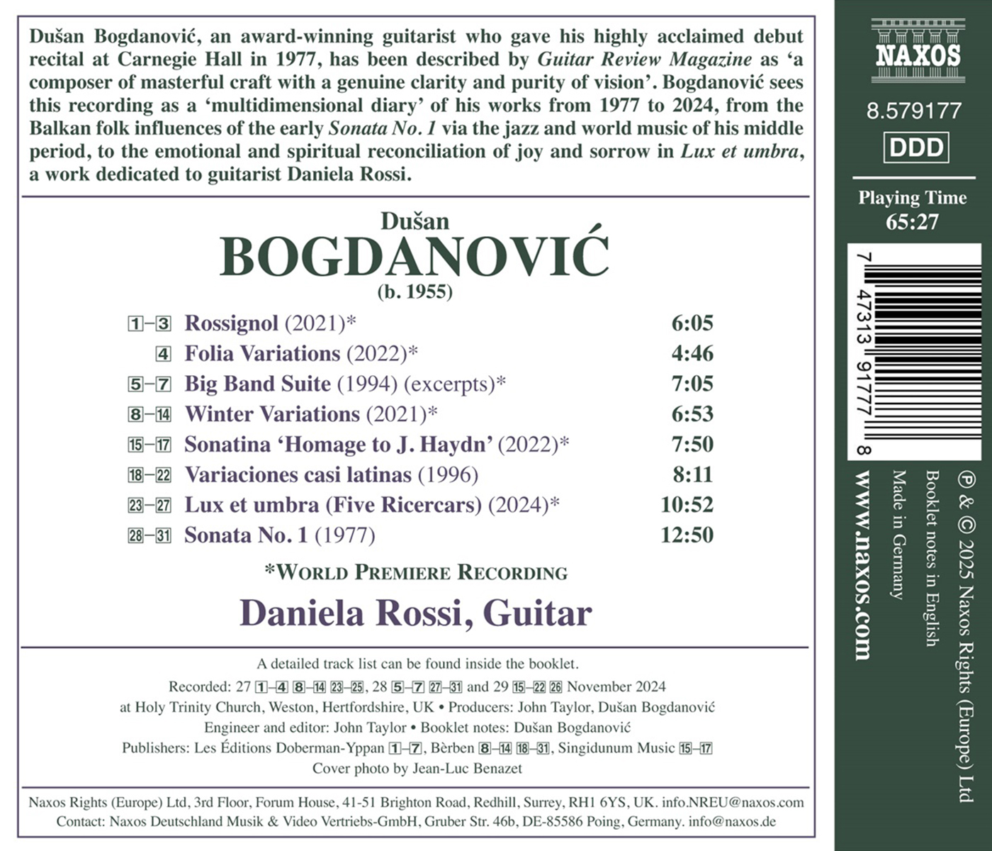 Dušan Bogdanović, ein preisgekrönter Gitarrist, der 1977 sein hochgelobtes Debütkonzert in der Carnegie Hall gab, wurde vom Guitar Review Magazine als ‚visionärer Komponist von meisterhaftem Können‘ beschrieben. Bogdanović betrachtet diese Aufnahme als ‚mehrdimensionales Tagebuch‘ seiner Werke von 1977 bis 2024, von den balkanischen Folk-Einflüssen der frühen „Sonate Nr. 1“ über den Jazz und die Weltmusik seiner mittleren Schaffensphase bis hin zur emotionalen und spirituellen Versöhnung von Freude und Trauer in „Lux et umbra“, einem Werk, das der Gitarristin Daniela Rossi gewidmet ist. Der Name Dušan Bogdanović ist einer, dem alle klassisch ausgebildeten Gitarristen irgendwann in ihrer Ausbildung und Karriere begegnen werden, und die Popularität seiner Musik spiegelt sich in Konzertprogrammen auf der ganzen Welt und einer Anzahl von erstaunlich vielfältigen Aufnahmen wider. Dieses neue Recital umfasst sechs Weltpremieren, darunter aktuelle Werke, die der ‚brillanten Mitautorin‘ seines musikalischen Tagebuchs, der Gitarristin Daniela Rossi, gewidmet sind. Diese Aufnahme ist von der Präsenz des Komponisten inspiriert und mit einem unverkennbaren Stempel der Authentizität versehen. Daniela Rossi ist eine klassische Gitarristin aus Bahía Blanca, Argentinien. Sie arbeitet gerne mit zeitgenössischen Komponisten wie Dušan Bogdanović zusammen und hat in letzter Zeit auch andere renommierte Komponisten wie Vincent Lindsey-Clark und Jeffrey McFadden dazu inspiriert, für sie zu schreiben.