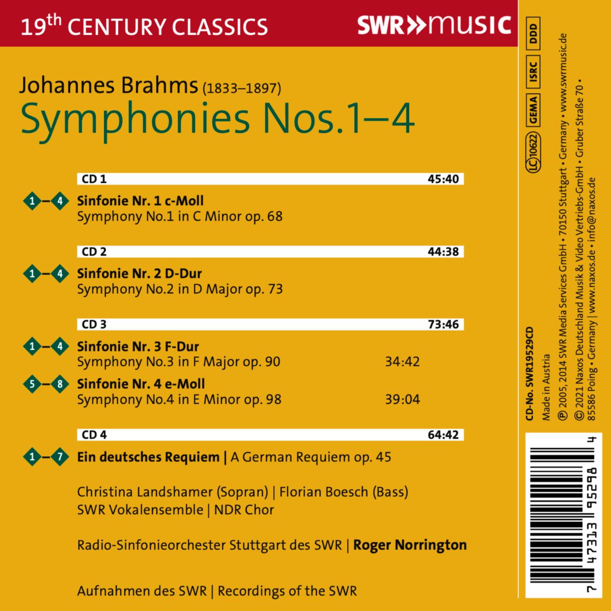 Die hier wiederveröffentlichten Aufnahmen der Sinfonien von Johannes Brahms entstanden 2005, wie stets bei Roger Norrington unter besonderer Berücksichtigung von Größe und Aufstellung des Orchesters, Tempi, Phrasierung und Artikulation. Der Komponist selbst hinterließ zu seinen Sinfonien gar keine Metronom-Angaben. Die vom bedeutenden Brahms-Dirigenten von Bülow überlieferten Angaben zu den Aufführungsdauern sind allerdings derart kurz, dass es keine sehr langsamen Tempi gegeben haben kann. Ergänzt wird die Sammlung durch eine phänomenal-luftige Aufnahme von „Ein deutsches Requiem“ mit dem SWR Vokalensemble und dem NDR Chor.