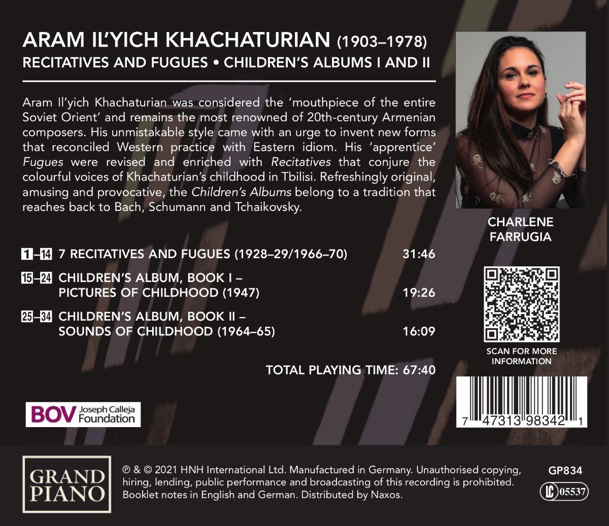 Aram Chatschaturjan wird üblicherweise mit seinen herrlich orchestrierten Ballett-Musik in Verbindung gebracht, insbesondere sein berühmter „Säbeltanz“ aus „Gayaneh“ ist Teil der Gegenwartskultur. Weniger bekannt ist Chatschaturjans Klaviermusik. Seine beiden „Kinderalben“ knüpfen an die Tradition Bachs, Schumanns und Tschaikowskys an. Das Ergebnis sind überraschend unaufdringliche, faszinierende Miniaturen von schlichter Schönheit. Die maltesische Pianistin Charlene Farrugia erweist sich als sensible Interpretin dieser zu Unrecht wenig beachteten Werke.