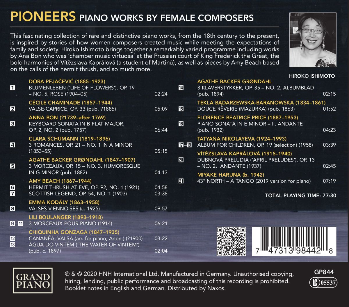 Hiroko Ishimoto hat für dieses Album ein bemerkenswert vielfältiges Programm zusammengestellt, darunter Werke von Ana Bon, die am preußischen Hof König Friedrichs des Großen „Kammermusikvirtuosin“ war, die kühnen Harmonien von Vít?zslava Kaprálová (eine Schülerin Martin?s), sowie Stücke von Amy Beach, die auf den Rufen der Einsiedlerdrossel basieren, und vieles mehr.