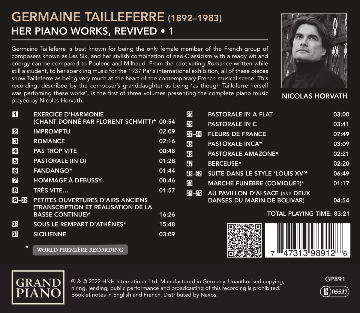 Germaine Tailleferre ist vor allem als einziges weibliches Mitglied der französischen Komponistengruppe „Les Six“ bekannt. Ihre stilvolle Kombination von Neoklassizismus mit ausgeprägtem Esprit und Dynamik kann durchaus mit Poulenc und Milhaud verglichen werden. Von der fesselnden „Romance“, die sie noch während ihres Studiums schrieb, bis hin zu ihrer spritzigen Musik für die Pariser Weltausstellung von 1937 zeigen alle diese Stücke, dass Tailleferre im Zentrum der zeitgenössischen französischen Musikszene stand.