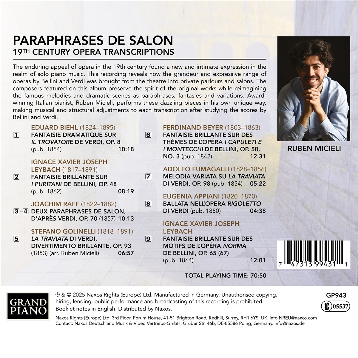 Die anhaltende Faszination der Oper im 19. Jahrhundert fand im Bereich der Klaviermusik einen neuen, intimen Ausdruck. Die auf diesem Album vertretenen unbekannten Komponisten wie Ferdinand Beyer und Adolfa Fumagalli bewahren den Geist der Originalwerke von Vincenzo Bellini und Giuseppe Verdi, und interpretieren die berühmten Melodien und dramatischen Szenen neu als Paraphrasen, Fantasien und Variationen. Pianist Ruben Micieli spielt diese schillernden Stücke auf seine ganz eigene Weise. Opern-Transkriptionen wurden von großen Komponisten wie Franz Liszt und Pjotr Tschaikowski angefertigt. Diese sind jedoch nur die Spitze des Eisbergs, wenn man die schiere Menge an Transkriptions- und Arrangementmaterial für Klavier im 19. Jahrhundert betrachtet, das nicht nur für Konzerte, sondern auch für den privaten Gebrauch in der Zeit vor der Erfindung von Aufzeichnungs- und Wiedergabegeräten geschaffen wurde. Ruben Micieli präsentiert uns nicht nur ein atemberaubend interpretiertes Programm dieser selten zu hörenden Operntranskriptionen, sondern fungiert in seinen Interpretationen auch als Arrangeur, der jedes Stück künstlerisch überarbeitet, um fehlende Melodien hinzuzufügen und andere Verfeinerungen vorzunehmen, um die ursprüngliche Absicht dieser Werke zu unterstreichen. Er ist ein aufstrebender Star der Musikwelt, sowohl als virtuoser Pianist als auch als Komponist und Dirigent. Er gewann den zweiten Preis und einen Sonderpreis für die beste Interpretation von Liszts Sonate in h-Moll beim 9. Internationalen F.-Liszt-Klavierwettbewerb Weimar-Bayreuth 2018 und hat sich in über 40 nationalen und internationalen Wettbewerben ausgezeichnet.