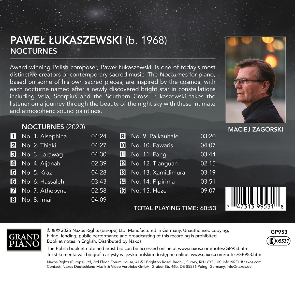 Der preisgekrönte polnische Komponist Paweł Łukaszewsk ist einer der herausragendsten Schöpfer zeitgenössischer geistlicher Musik. Die „Nocturnes für Klavier“, die auf einigen seiner eigenen geistlichen Werke basieren, sind vom Kosmos inspiriert, wobei jede Nocturne nach einem neu entdeckten hellen Stern in Sternbildern wie Vela, Skorpion und Kreuz des Südens benannt ist. Łukaszewski nimmt den Zuhörer mit diesen intimen und atmosphärischen Klanggemälden auf eine Reise durch die Schönheit des Nachthimmels. Maciej Zagórski ist Pianist und Lehrer. Sein besonderes Interesse gilt der polnischen Klaviermusik aus der Zeit vor Chopin und zeitgenössischen Werken. Er konzertierte bereits vielfach in Europa, Japan, Palästina, Russland und den Vereinigten Staaten, sowohl als Solist mit Orchestern als auch als Kammermusiker. Derzeit ist er Präsident des Musikrats der Jan-Długosz-Universität in Częstochowa.